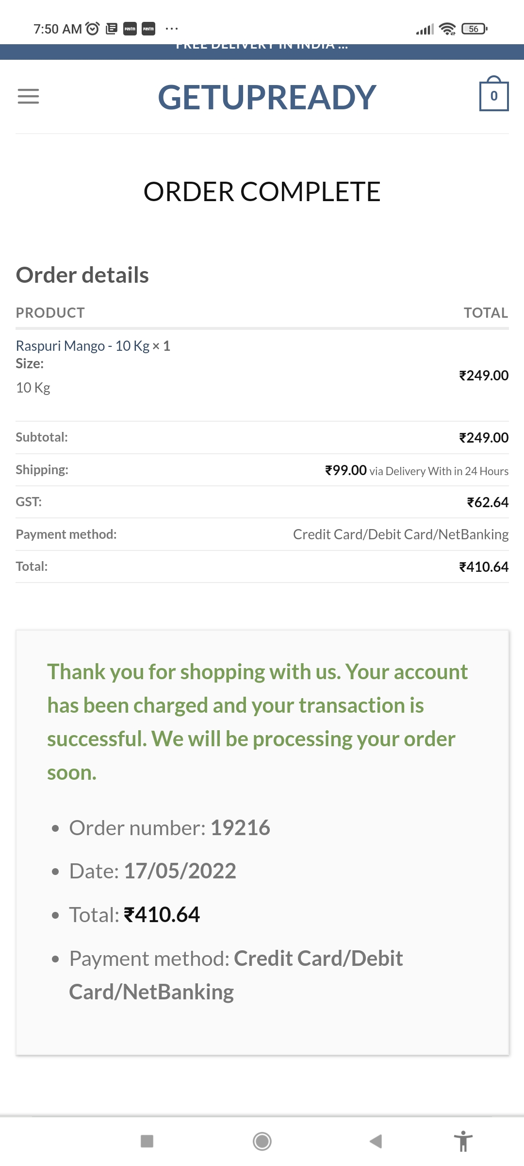 I placed order on getupready site for 10 kg alphanso mangoes. SMS from Bank is given below for ref.