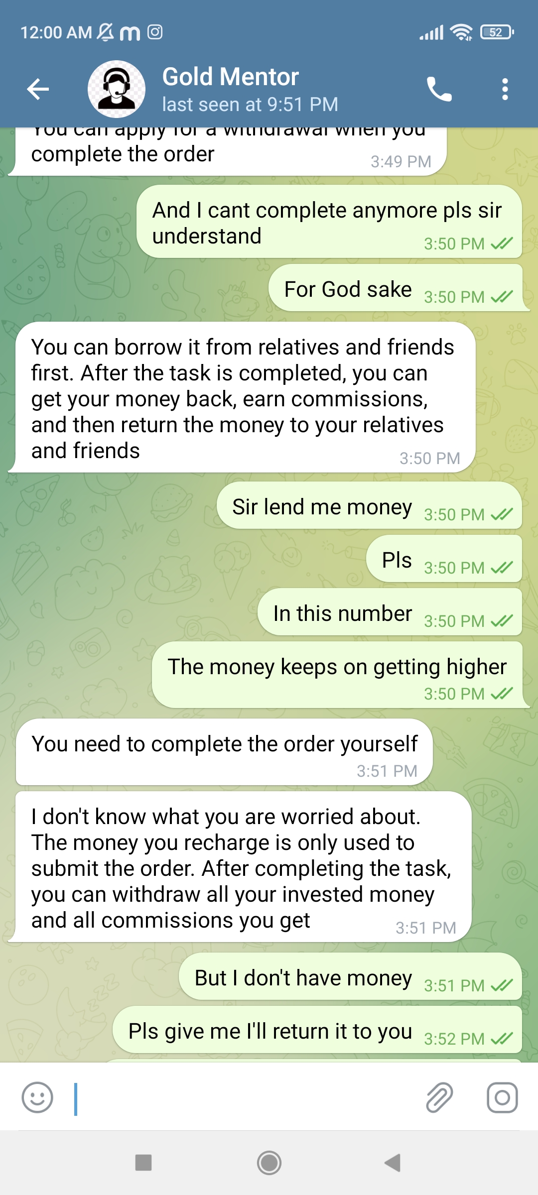 I got a message on whatsApp for a part time job which would need 10-30 minuted… A recruiter named Jimmy told me to make a work account for that in that website for getting the salary which was about 1000-3000 I was interested.. I was charged 100 for activation and got 3 task to complete I completed and got 240 including commission I was directed by a person named gold mentor in the telegram app I was happy with the service but after that i thought I could make more money but the website said it needed some money for fetching me some orders I invested for that it had some levels of recharging I recharged for 1000 i got 15 orders to complete but after submitting orders the money keeps increasing in asked me to add more funds it was showing some commission also. The mentor said I need to complete all the orders for getting the money back the funds kept getting increased randomly after submitting some orders. I was in panic. I thought I cannot get my money back but the mentor said my money is safe I can withdraw it anytime after completing all 15 orders but I lost almost 70000rs and i still need 70k for completing the last order my money is stuck there and the mentor keeps on repeating I cannot get the money until I finish the last order I am in a big trouble.