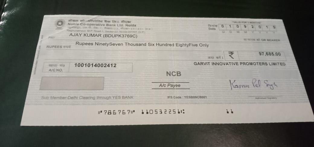 My name is Ajay Kumar and i was retired constable from Indian Army in march-2019. I had invested in GARVIT INNOVATIVE PROMOTERS LIMITED (BIKE BOAT) company while in my service, I have given this assurance against this Post Dated cheque number – 786767,dated 01/09/2019, Through Bank Noble Co-operative Bank Ltd. Noida, I will get this amount from this company on the given time, but before I put this cheque in my account, this company will cheat all the investors and go from their temporary address. It was over.
