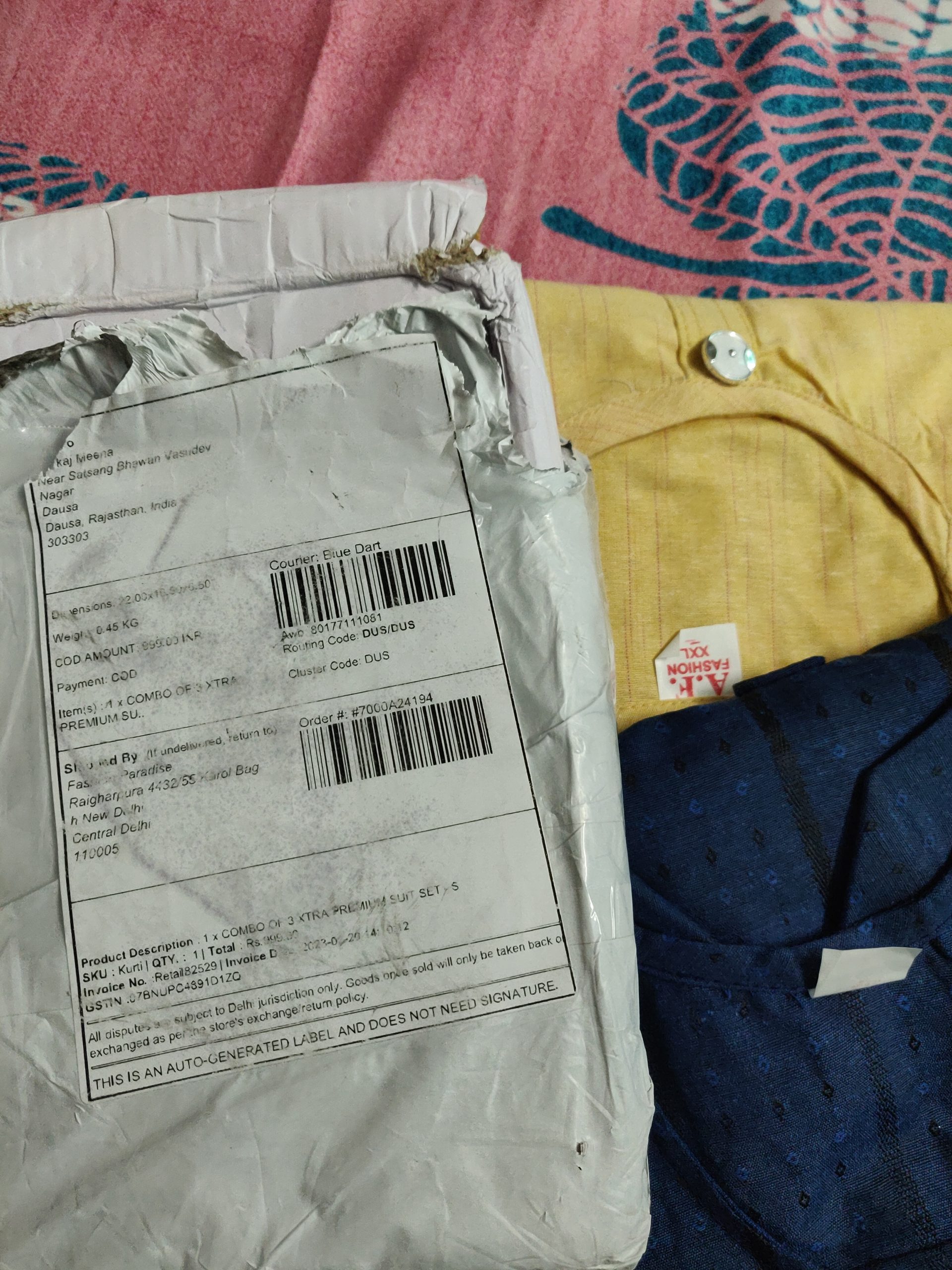 I have received a product from fashion paradise raighrpura 4432/55 Karol bagh new Delhi Central Delhi 110005. In this product a combo of 3 xtra premium suit . This product I haven’t order and received as cash on delivery. I have done payment through phone pay QR code scanner thought that someone in the family ordered but later know that no one had ordered that item.