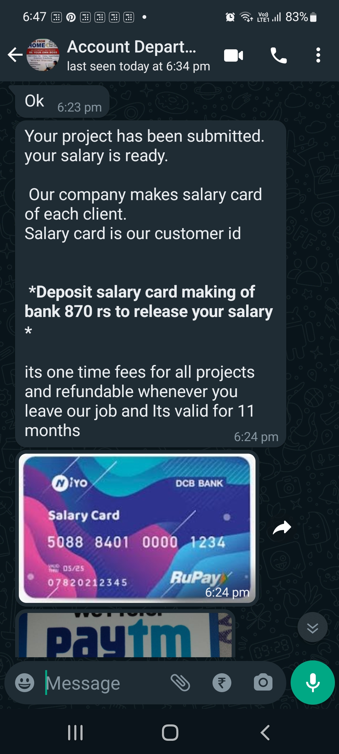 They approached me for part time job from mobile no7889115673 from data solutions pvt Ltd. and after i ask some questions to them from whatsapp chat only i was convinced with them.. but after completing the job they told me to contact number 8437071547 (accounts dept.). This number contacted me for few days to pay 870rs as fees for salary card charges from bank. They told me It is compulsory But I haven’t done that from some days. But when I contacted the introducer about the accounts dept. Number is not active, he gave another number (7009529347), this number told me 870 as salary card charges.