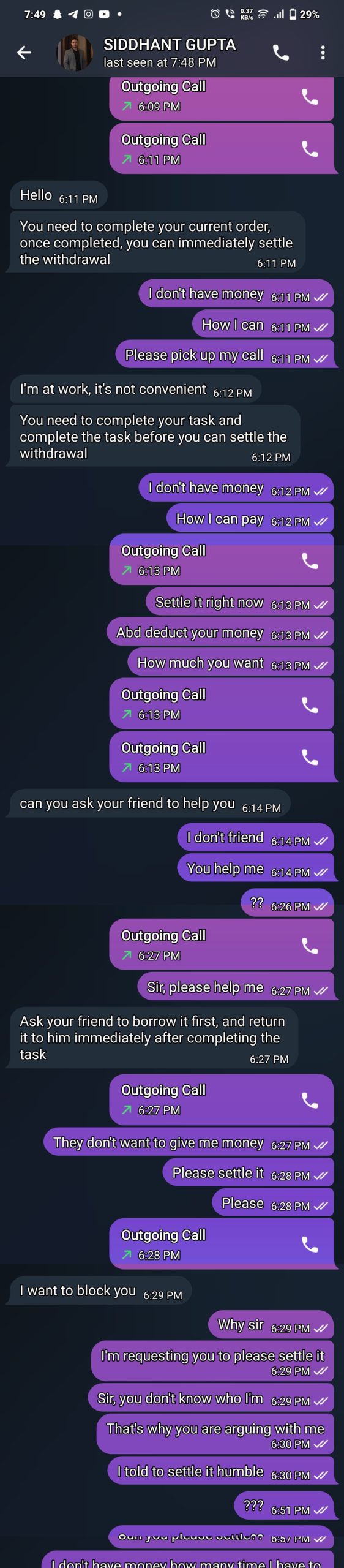 In today morning one lady massaging me on WhatsApp and she told me I am from Amazon mall and you want to ear daily 200 to 2000 then contact me. I am middle class family so, I excitement I follow her as she told then she told me recharge 200 rup and earn 400 I recharge then she give me one telegram person link and told me he will teach you how to withdraw I msg him. He told me then he told me if you want back your money complete the task I have no choice then again and again I have recharge or pay up to 5000 rupees now he say one more recharge of rupees 9000, then I told him I don’t have that much money you stop this and give my money back to me.