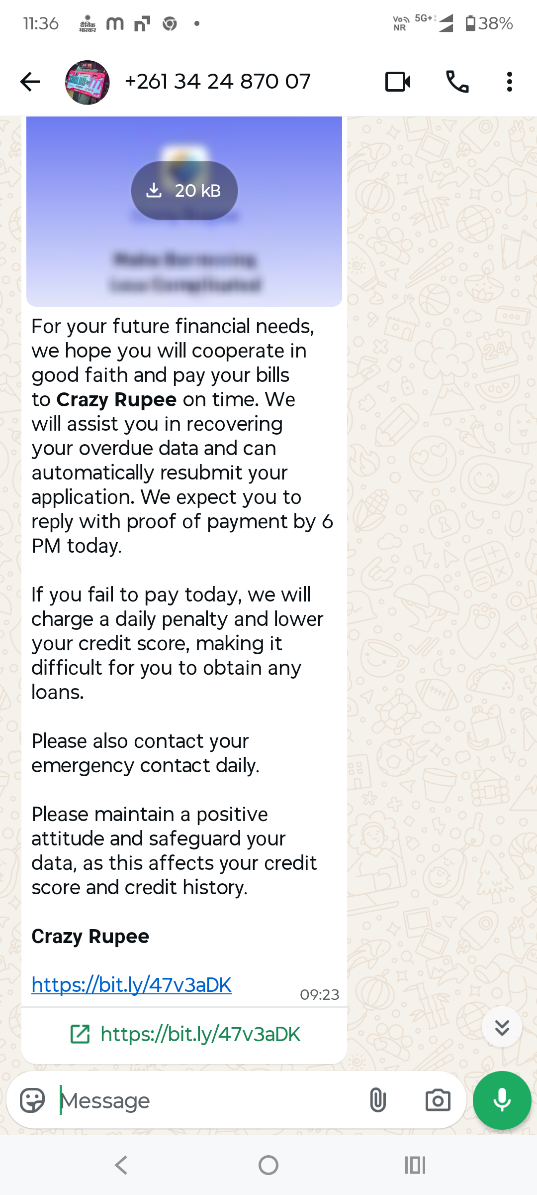 I don’t take any loan from crazy rupees app but In WhatsApp I gotten message for payment.why this message is sending me my contact number is 8000156042 .check and stop this issue