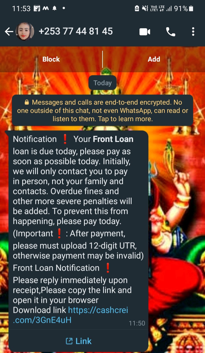 I haven’t taken any loan from this Front loan app, but a person contacting through whatsApp and harassment for loan due payment.