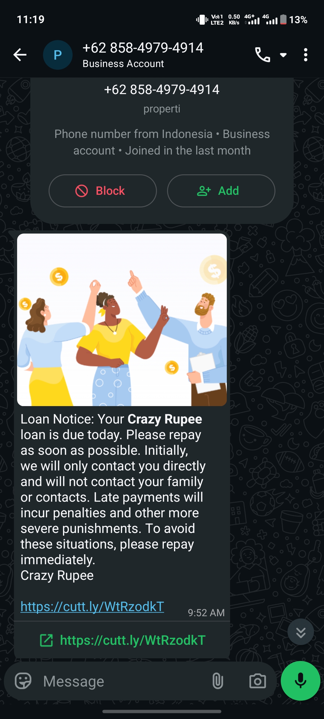 have not taken any loan from this app.crazy rupee but still getting message and threats on WhatsApp.