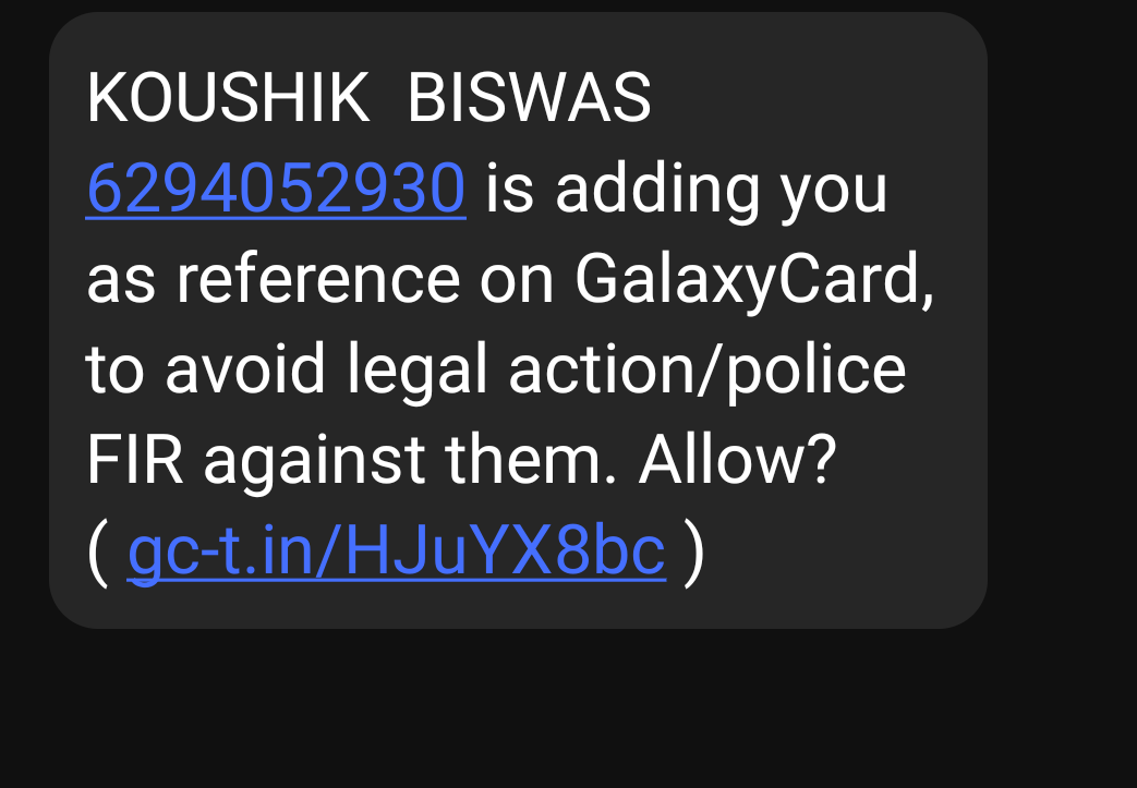 I’ve received a SMS saying Koushik Biswas has added me as a reference for Galaxy Card. Please do the needful as I’m not included in this.