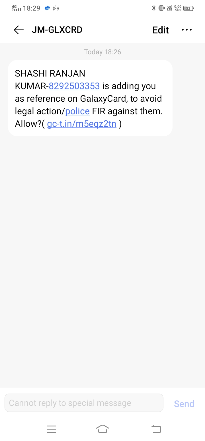 SHASHI RANJAN KUMAR-8292503353 is adding you as reference on GalaxyCard, to avoid legal action/police FIR against them. Allow?( gc-t.in/m5eqz2tn )