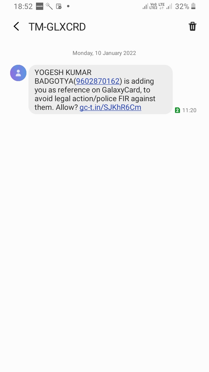 YOGESH KUMAR BADGOTYA(9602870162) is adding you as reference on GalaxyCard, to avoid legal action/police FIR against them. Allow? gc-t.in/SJKhR6Cm