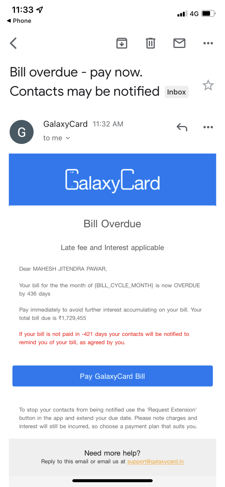 My name is Mahesh I was suffering from some Financial Issues In some days I have seen galaxy credit card in advertising I have apply for Credit they have provided credit of 1000 inr afterwards I have paid all the dues and now after 1 year they have send me email and saying I have dues of 17,29,445 inr Please help Me out Otherwise I need get hang my self to Death