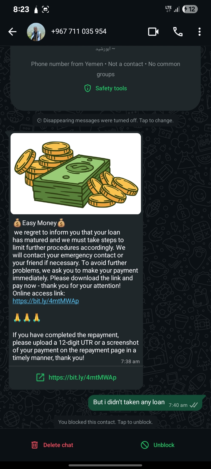 Getting loan due warning on whatsapp from unknown no. And even warning to defame and contacting my family for loan recovery . I hadn’t take any loan from such company name .
