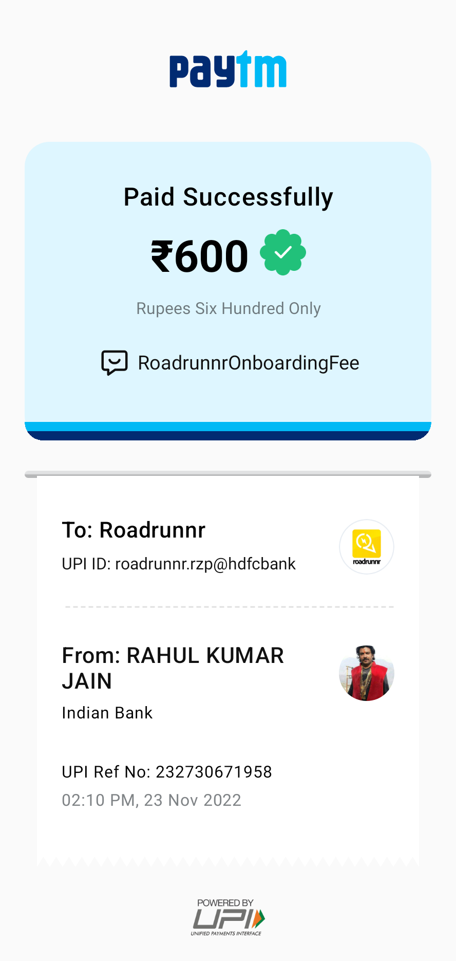 Sir myself Rahul Kumar Jain I have applied Zomato delivery partner job on online registration app. I feel all the details on Zomato app given payment of 600 in there road runner account through Paytm but till now my ID is not activated I already send them the request to Zomato partner there is no response or reply for my queries. The numbers given on website they are not working I want my money back in my account so please help me