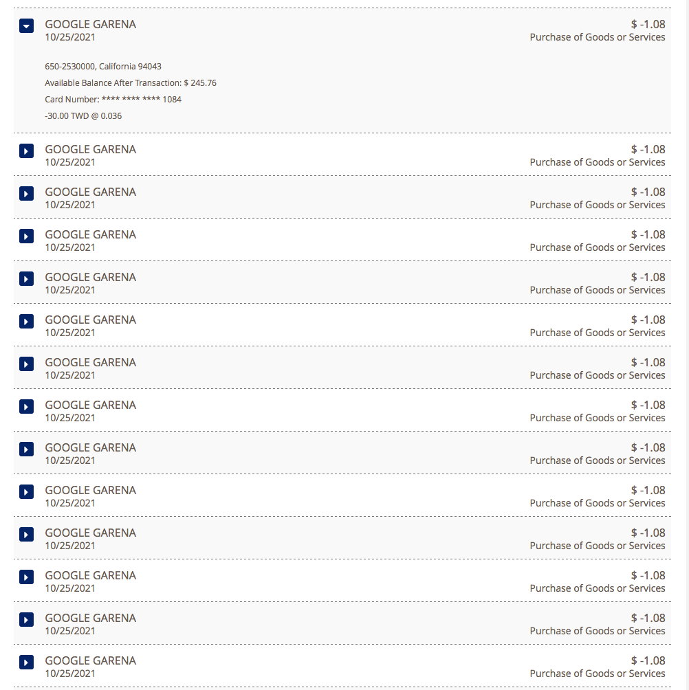 I was charged $1.08 fourteen times in a row by “Google GARENA” on October 25, 2021.