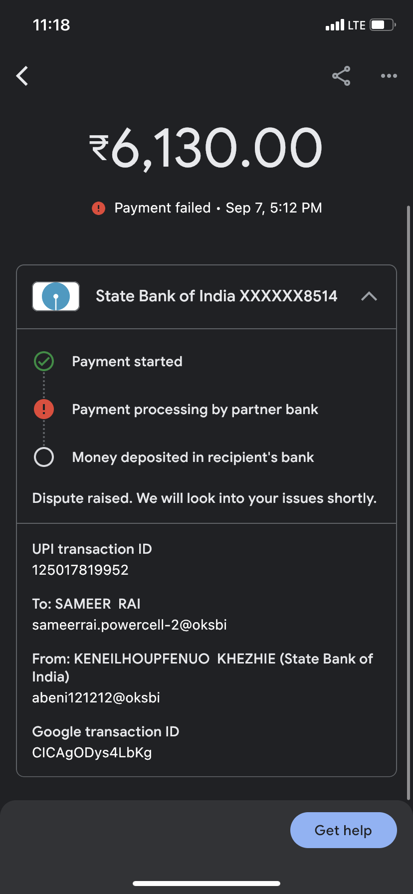 Sir, I made a payment on 7th sept via Google pay (amount of 6130). The transaction failed but the money never got credited back into my account. Kindly look into it