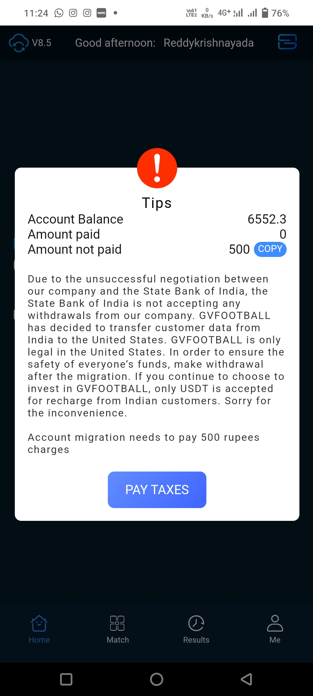 I have invested 5000 rupees in gv football then it’s asked again 500 rs then I Invested again 500 then I withdrawl my money then it’s asked again 500 for account transfer then I again deposited 500 rs then total 6500 I withdrawl but it’s only in pending now app and website not opening please help to get back my amount