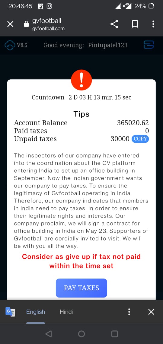 I have invest money in gv FOOTBALL application and this was shows that this is real investment application so I believe in this but this company not withdrawing my money and ask to pay more money in this form of tax .