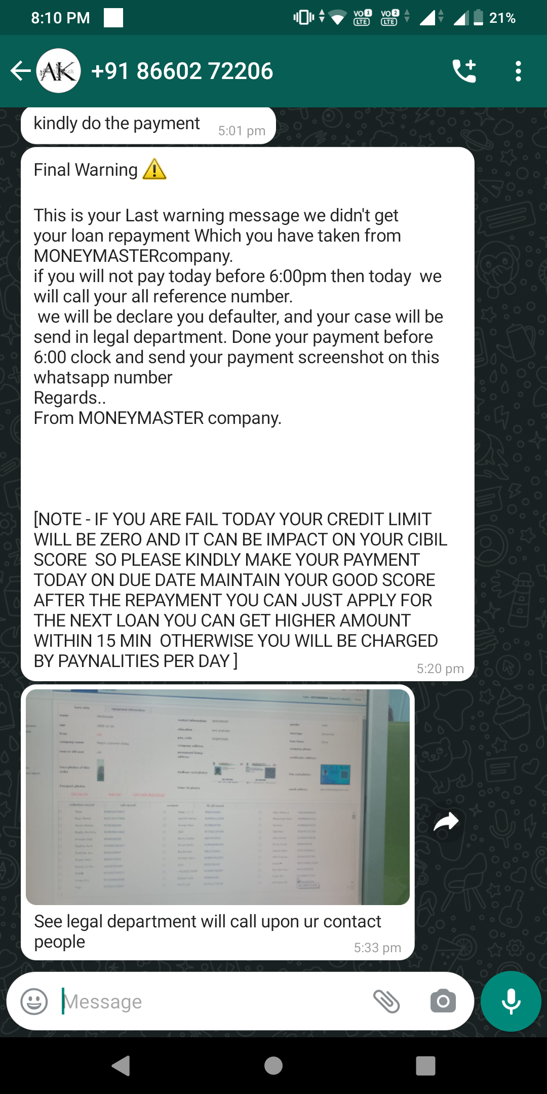 I took loan from lendmall app okmaster product. I was not able to pay loan due to some personal issue and I asked them for some time. But they are threatened ne that they will call to all my contacts which they have been accessed from my mobile.
