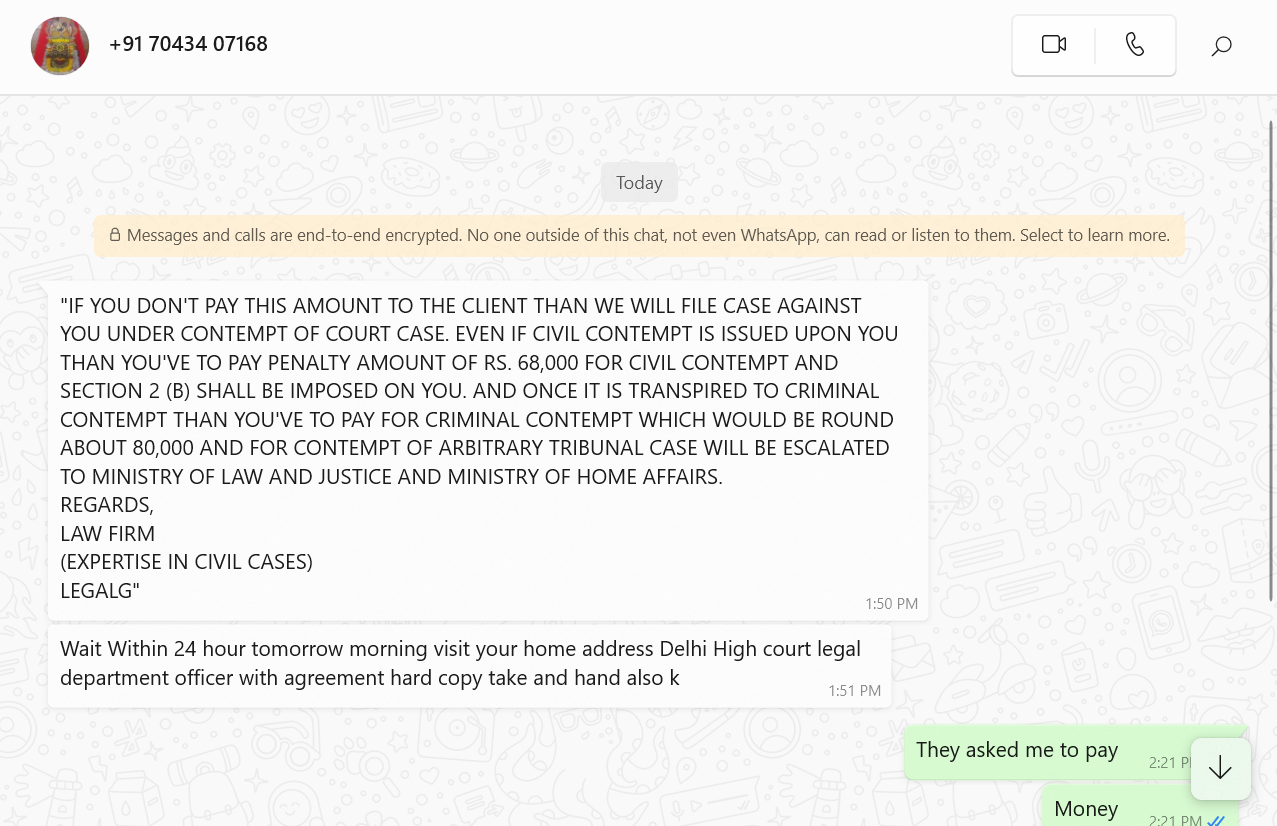 “IF YOU DON’T PAY THIS AMOUNT TO THE CLIENT THAN WE WILL FILE CASE AGAINST YOU UNDER CONTEMPT OF COURT CASE. EVEN IF CIVIL CONTEMPT IS ISSUED UPON YOU THAN YOU’VE TO PAY PENALTY AMOUNT OF RS. 68,000 FOR CIVIL CONTEMPT AND SECTION 2 (B) SHALL BE IMPOSED ON YOU. AND ONCE IT IS TRANSPIRED TO CRIMINAL CONTEMPT THAN YOU’VE TO PAY FOR CRIMINAL CONTEMPT WHICH WOULD BE ROUND ABOUT 80,000 AND FOR CONTEMPT OF ARBITRARY TRIBUNAL CASE WILL BE ESCALATED TO MINISTRY OF LAW AND JUSTICE AND MINISTRY OF HOME AFFAIRS.