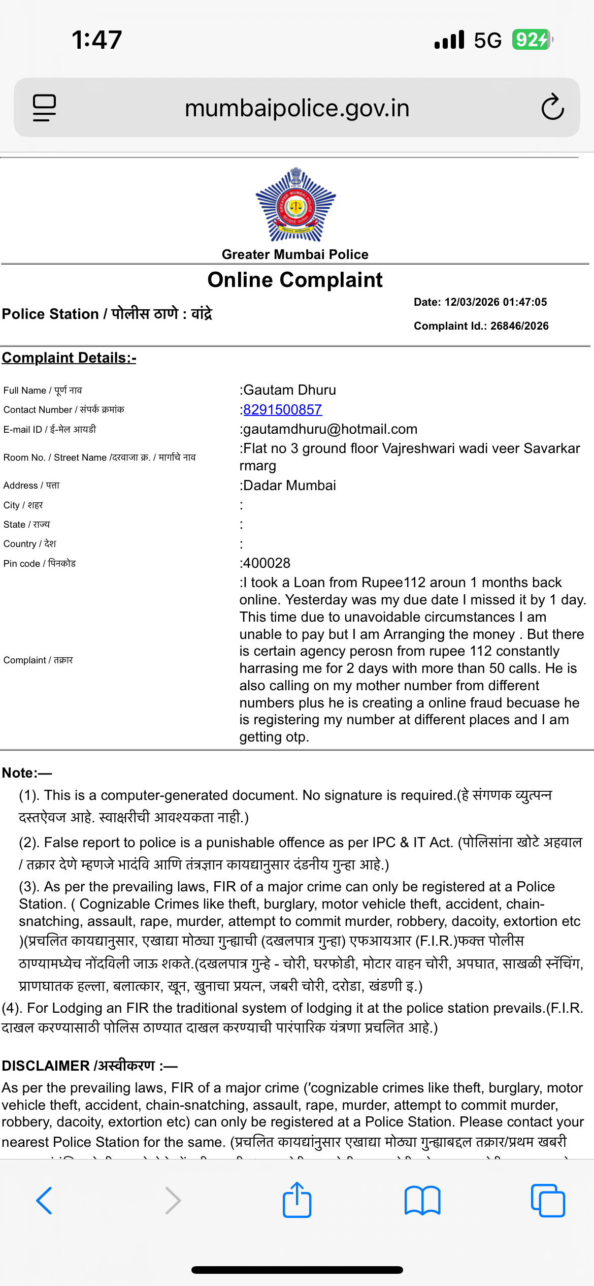 | Date of Complaint | March 12, 2026 |