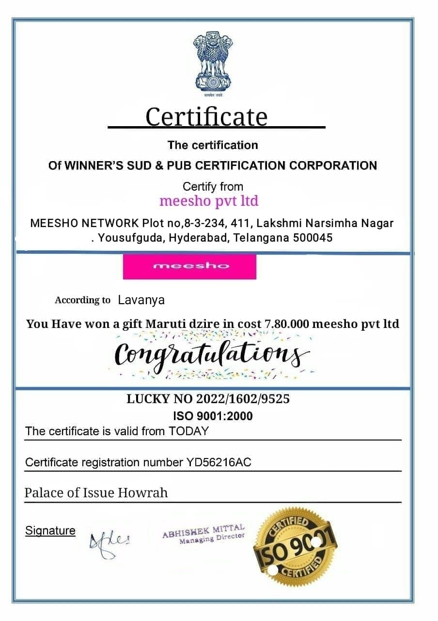 Registered ,my hone no was in the name of meesho lucky draw winner. There is a phone number and we call him and ask it is true or what it is. They told us we are from MEESHO office Bangalore branch, They slowly ask us to pay some money for processing the amount. we believe it and give money to them. We give 24,300 rupees. after all this they again and again ask money they said term like TDS, GST, NOC etc..