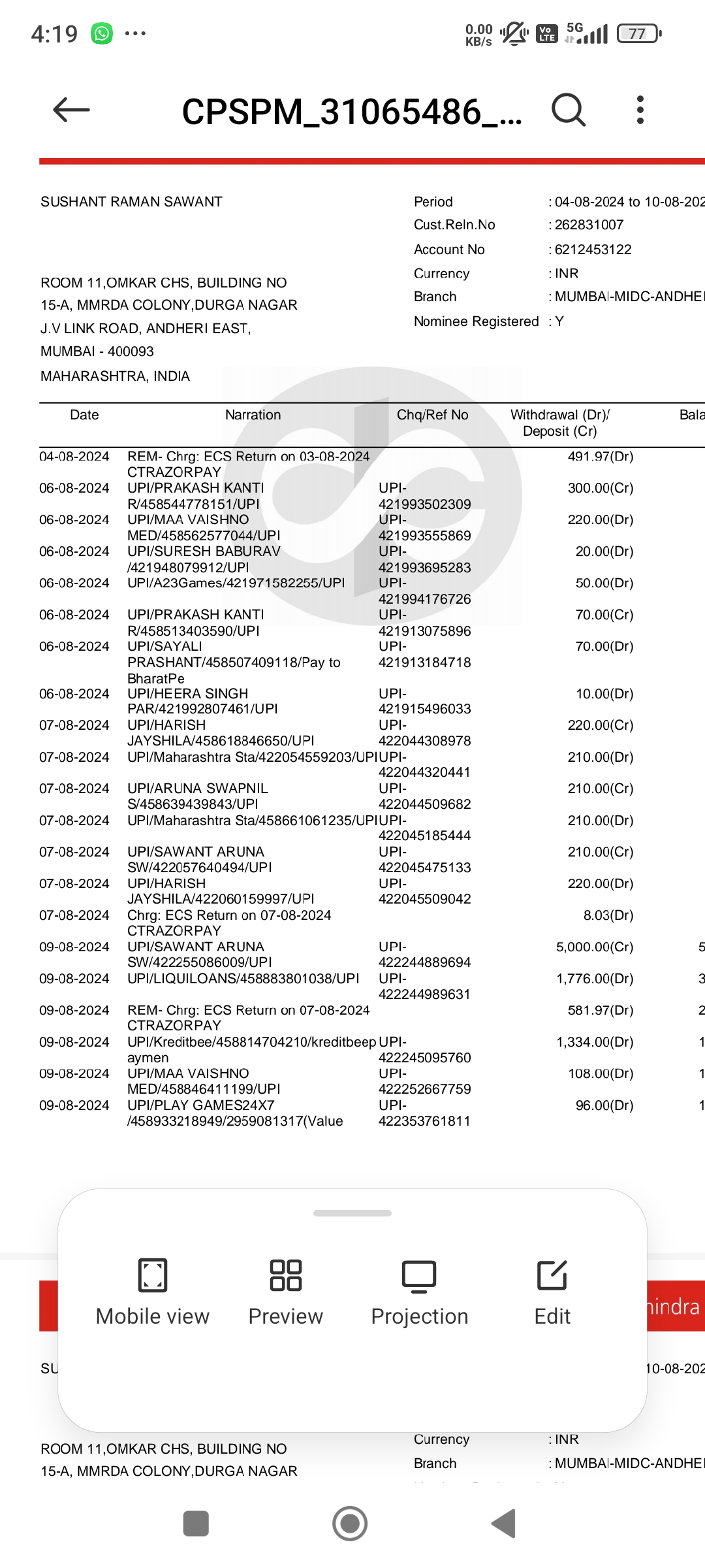 My bank account money automatic debit money 481/- First date 4/08/2024 and second date 9/08/2024 debit money 581/-