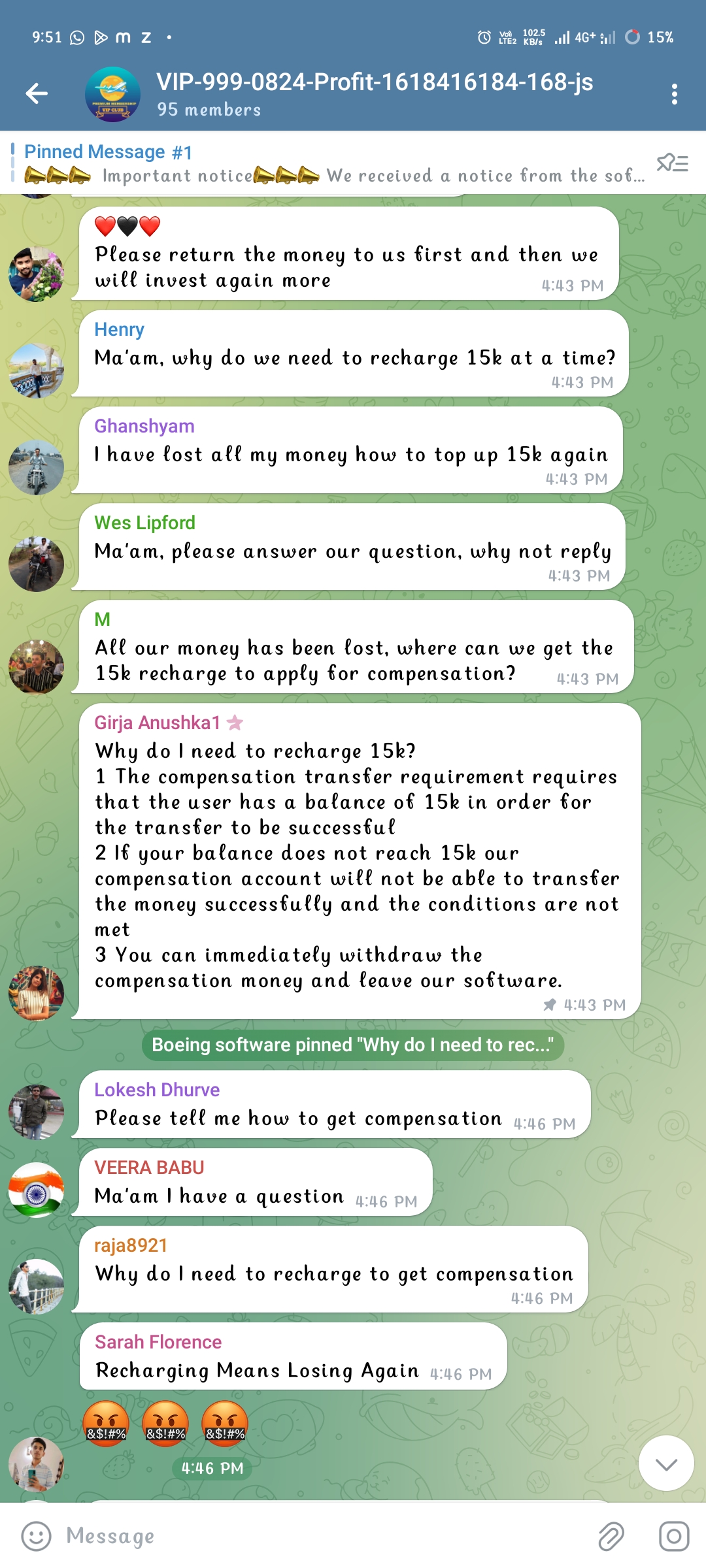 They asked me to do recharge of 1000 first her telegram account was Pushpa .Then they said 1000 plan has ended , so she gave me a link of another person his name was VIRENDRA and this guy told me i have to do recharge of 2k more to buy 3000 plan so that their Boeing Software generate profit at 91 club , and I trust him I do it. Then after recharge they give me 6 days condition that i can withdraw Rs100 for 5 days then on 6th day i can withdraw all the money i earned in software but on day 4 some system upgrade problem come, then Bharat give me a link of another female person name Girija which is also involved in this scam they asked me to recharge of 15k to compensate all previous amount which comes to zero a normal user have to recharge of 15k so that they will give you all amount which is in my 91club as some of users got their money.