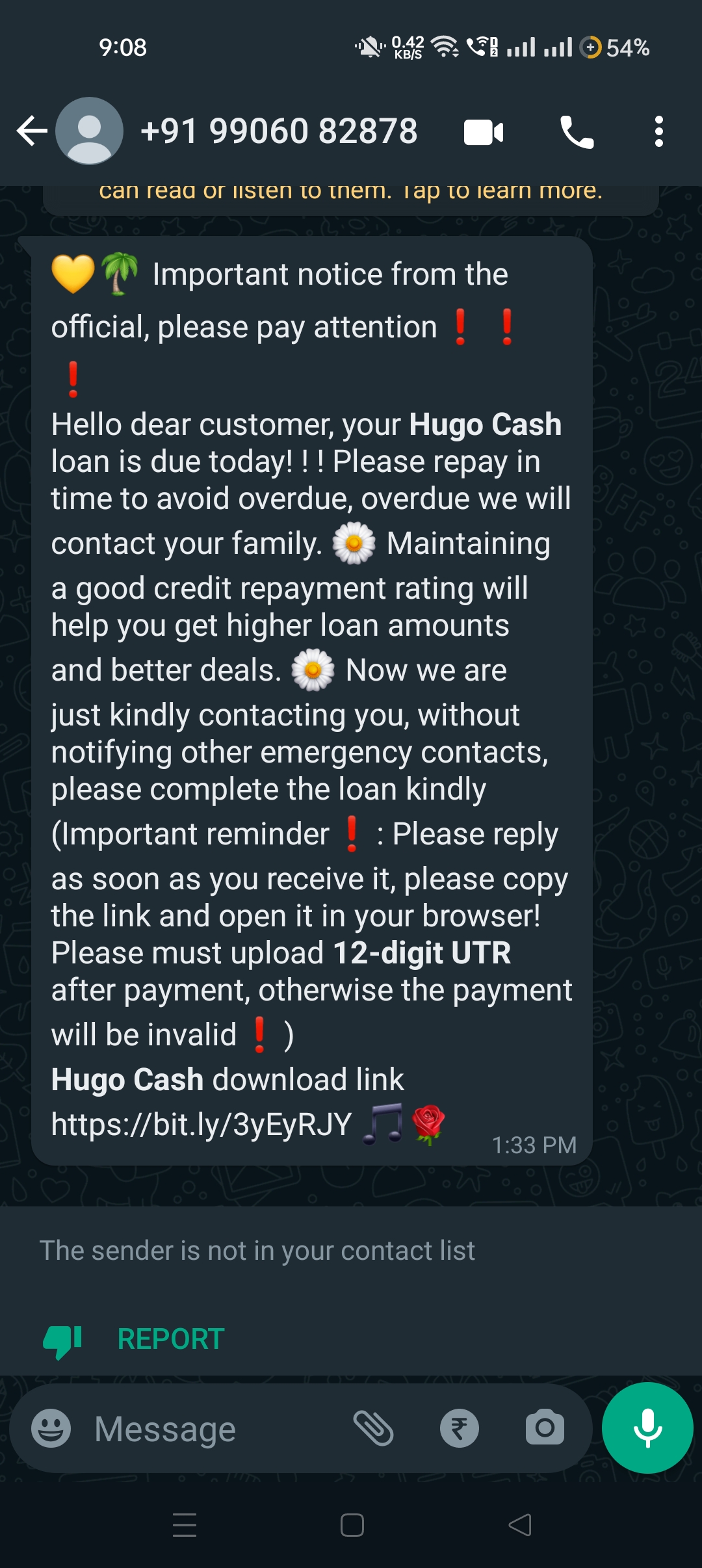 I didn’t apply for Hugo Cash loan app .They are constantly harassing me with loan repayment messages and threats . The more I’m reporting and blocking the more they are sending messages from numerous other numbers not only in whtsapp but also in ph messages ..moreover the app is not available in playstore ..They are scamming full fledgedly and disturbing a lot ..Actions must be taken otherwise they will continue their evil schemes