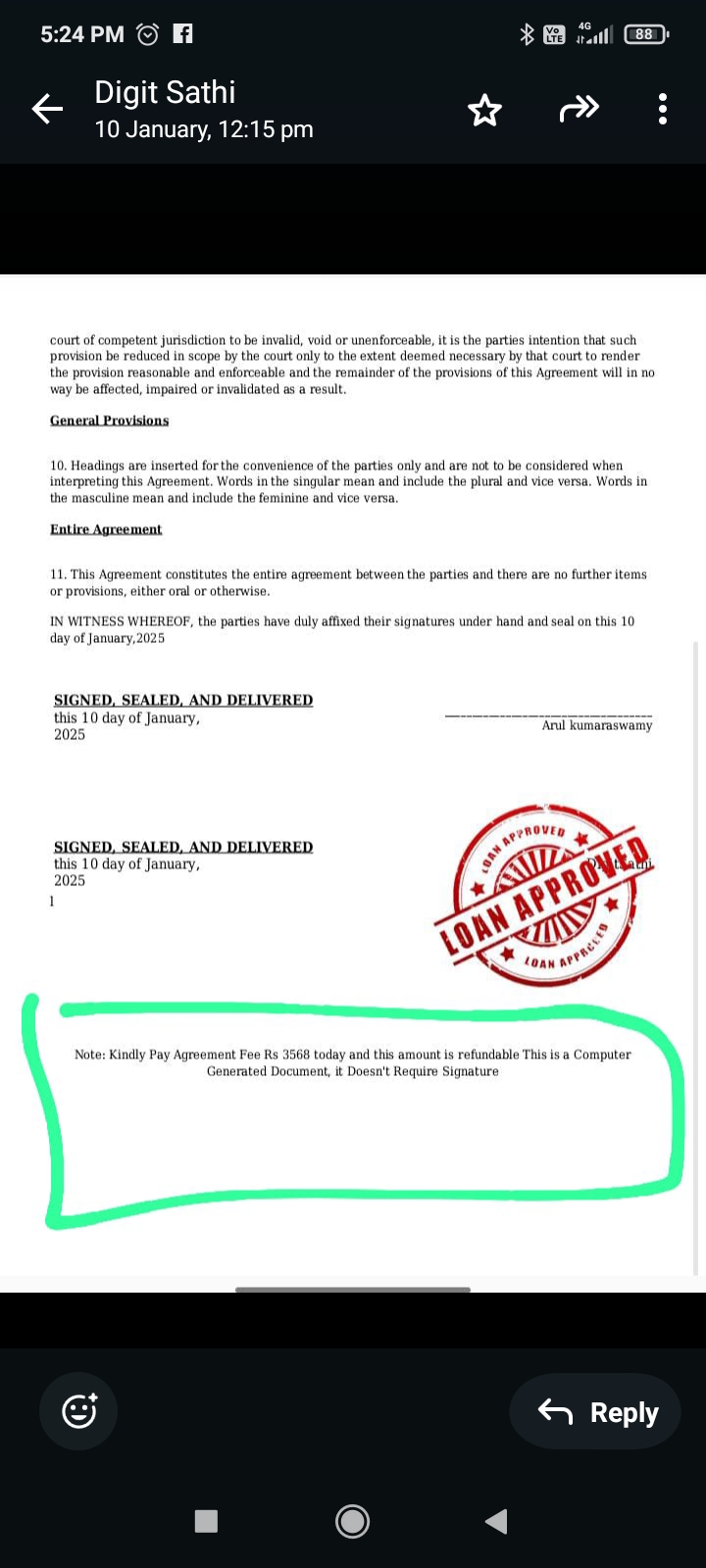 I was applied digit sathi web site on 10th january 2025 on personal loan amount 50000 after 10 minutes they sent your loan amount approved letter. In my mail id after one call come that person introduced iam call from digit sathi loan manager your loan will approved. Your loan amount disbursed in account with in 20 minutes but you will processing fees 2000 pay and send the receipt. After I disbursed in your account. I sent money and receipt. But money not come. Further they said another agreement fees pay then only your loan amount disbursed. I pay agreement fees also. Money not disbursed my account. Then I realized iam scammed. I call that person they not responses