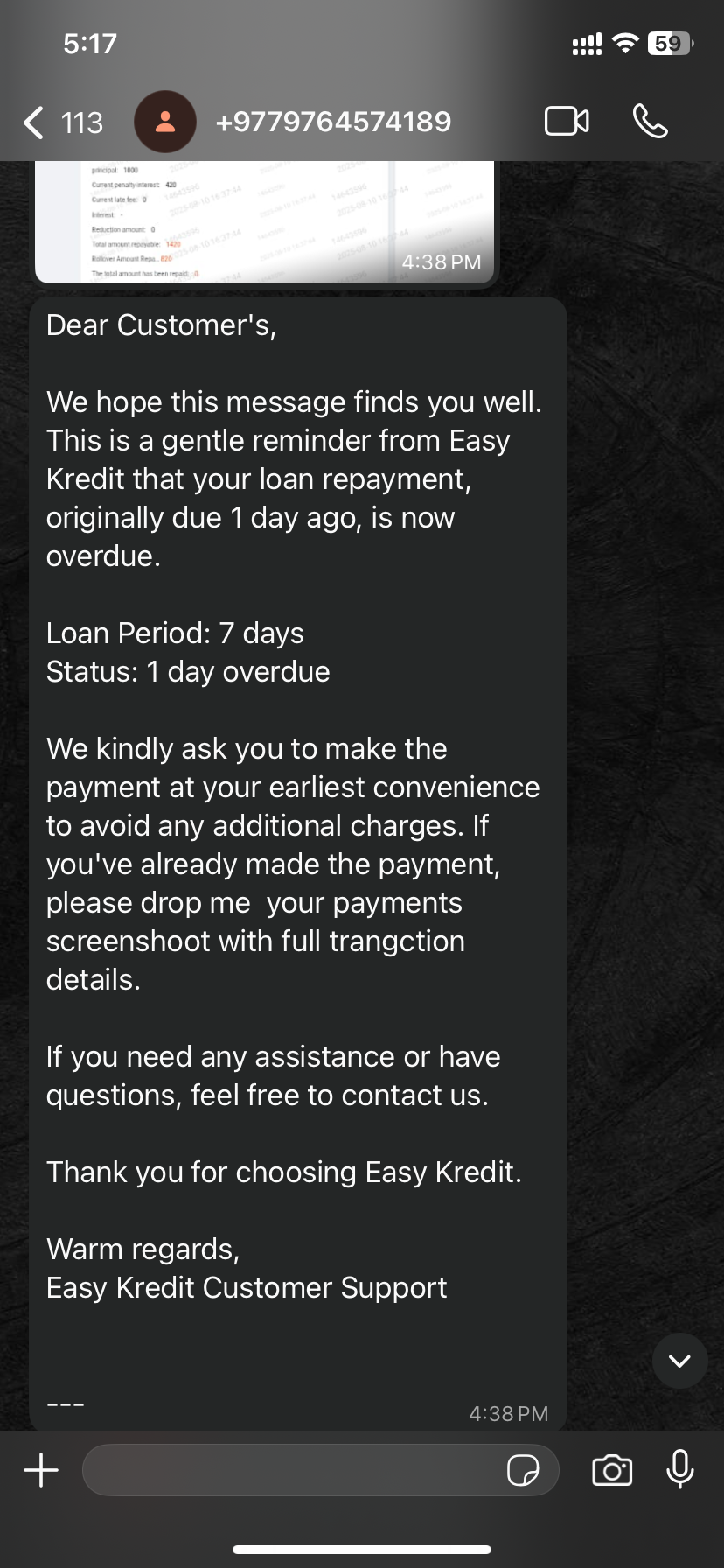 I would like to report a fraudulent message I received from someone claiming to be “Easy Kredit.” The message stated that I had an overdue loan and asked me to make a payment and share my transaction screenshot. I have never taken any loan from them.