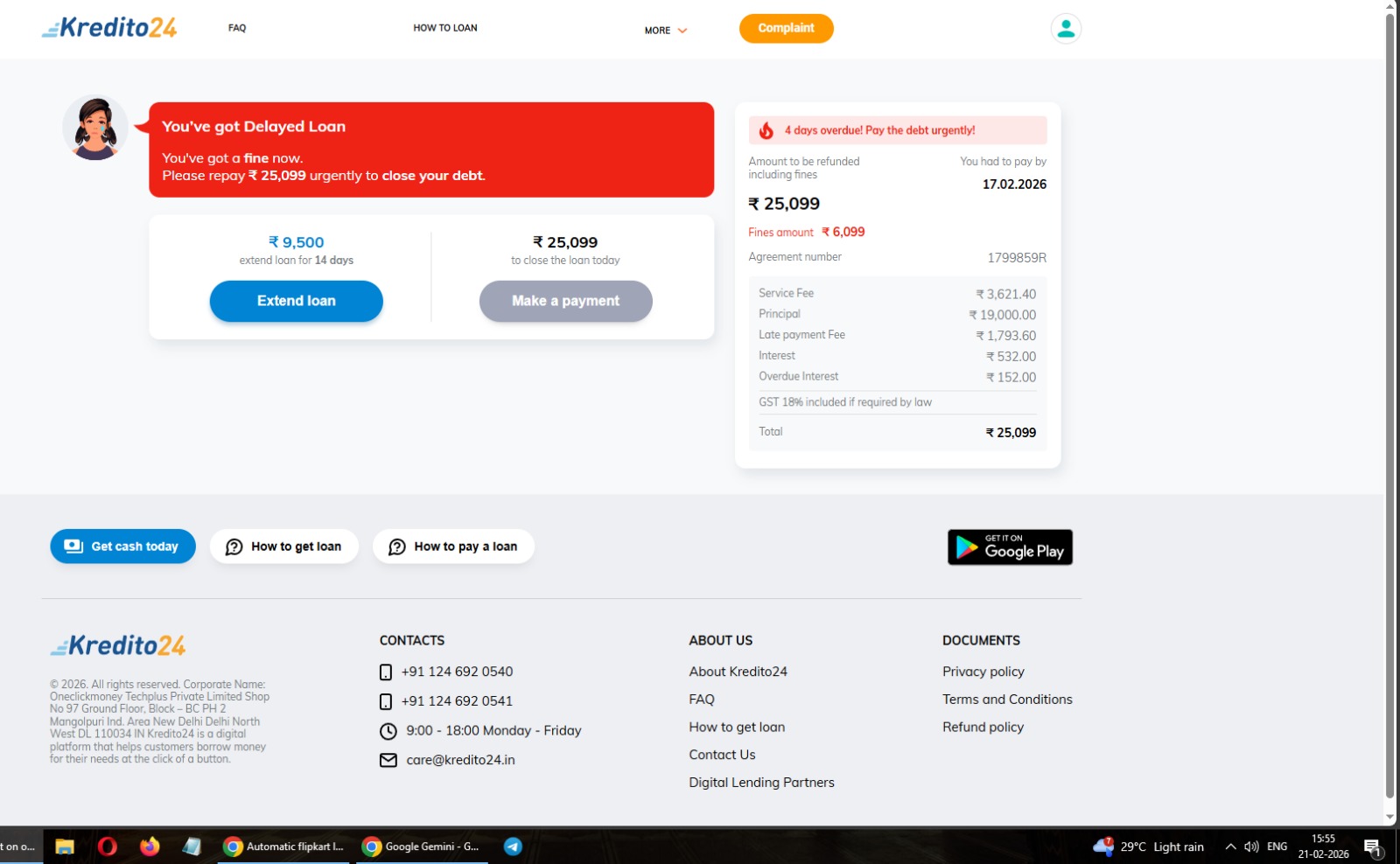 I applied for a loan of 20,000 from the app Kredio 24. However, I only received 16,000 in my account. The loan tenure was only 14 days, which violates RBIs Fair Practices Code for digital lending.Despite paying 9,500 back, the app is showing an outstanding balance of 25,200. They are charging exorbitant late fees and interest that were not transparently disclosed. Furthermore, I am being severely harassed by their recovery agents through threatening calls/messages. I am willing to pay the legitimate principal amount I received, but I refuse to pay these illegal and arbitrary charges.RequestI request the authorities to take strict action against this app for predatory lending and harassment. Please provide protection against any misuse of my personal data or contacts. transalate in hindi