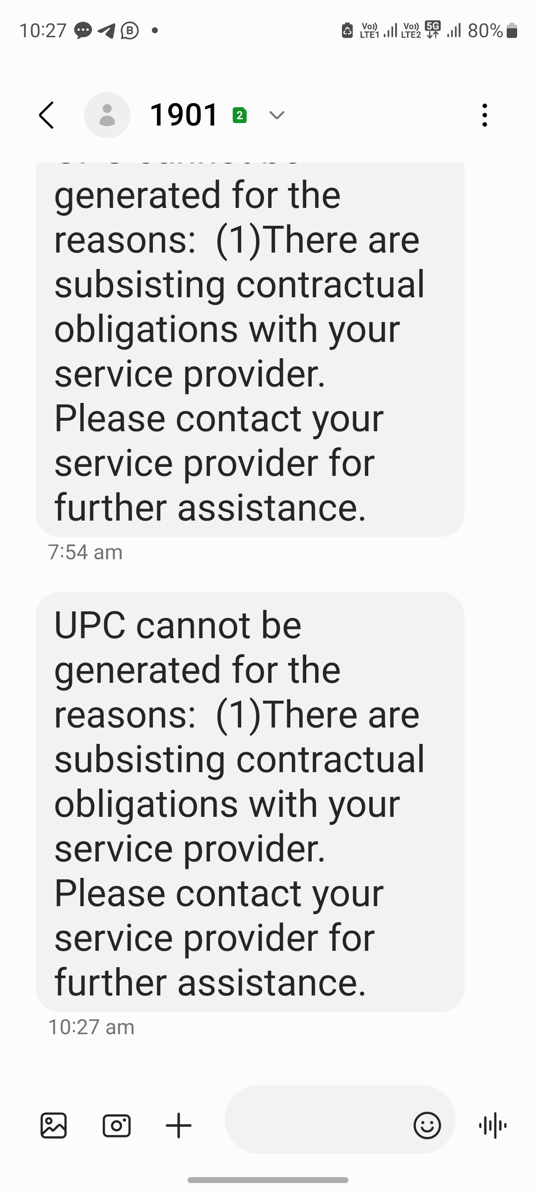 UPC cannot be generated for the reasons: (1)There are subsisting contractual obligations with your service provider. Please contact your service provider for further assistance.