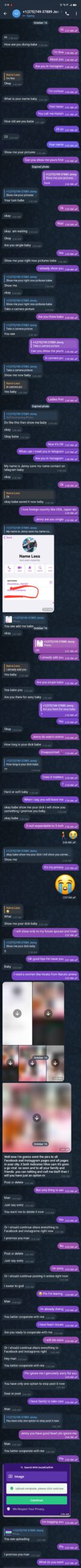 When I open in telegram to find gf, I find out this number idiot pretending act like girl named Jenny unfortunately who shares my piracy even photos asking more further details like 18+ talks. I had fear to share anymore. So I stop sharing. A person from this number threatening me with a money to stop my conversation in telegram. I ignore this. And this person posting my conversation chats in telegram upload in social media like fb to threaten me again and again. So I deleted all of my social media. Please help and save media