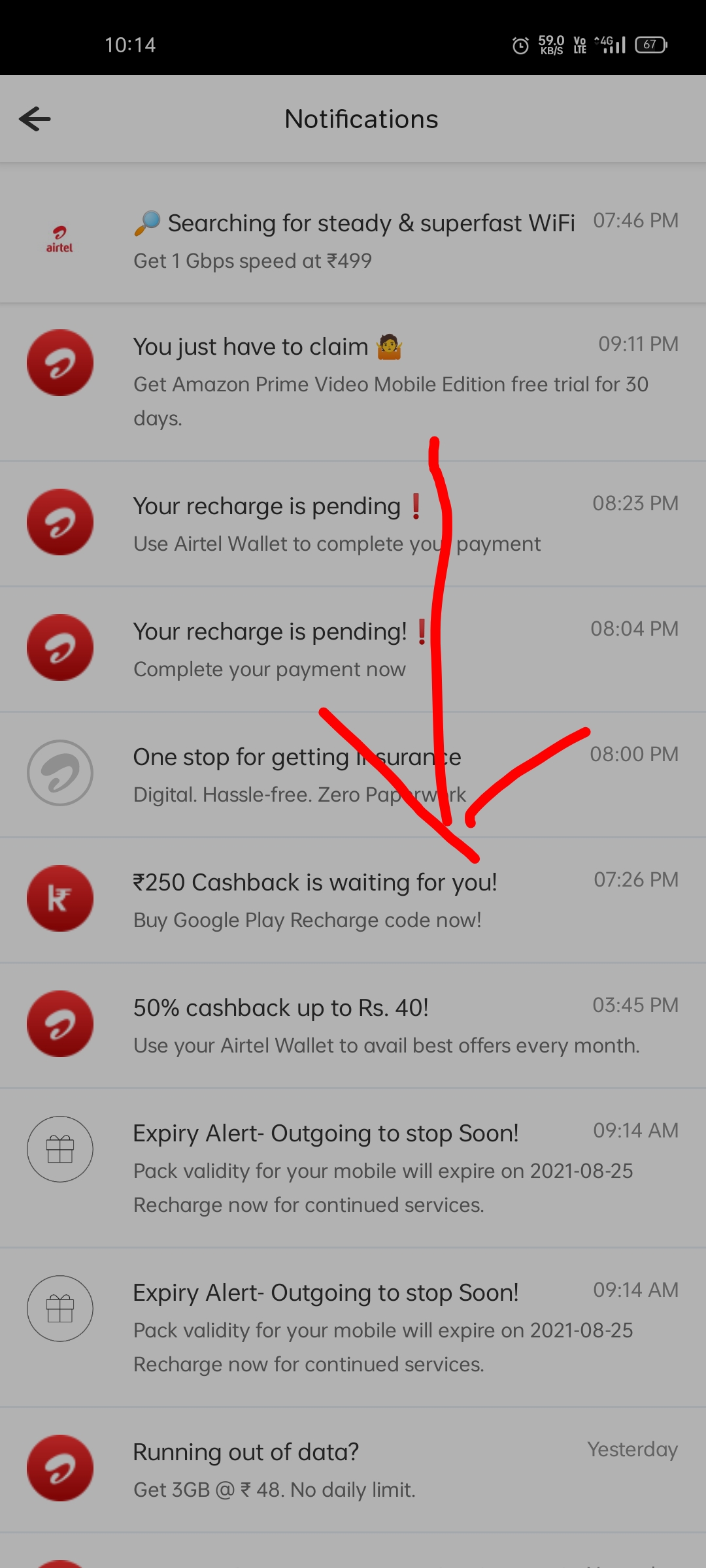 I get a offer on airtel app as 250rs cash back is waiting for you by buying Google Play redeem code above 50 rs then I purchased the Google Play redeem code but the cashback is not added to my airtel wallet please help for getting 250rs cash back