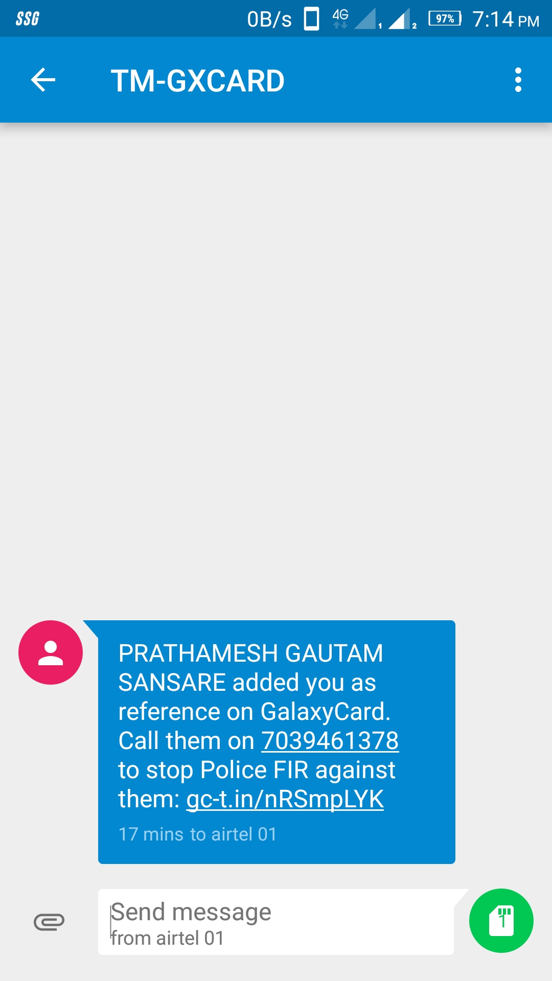 I HAVE GOT A MESSAGE FROM THIS FRAUDSTERS PLEASE TAKE IMMEDIATE ACTION ON THEM AND STOP PEOPLE FROM FALLING INTO THIS SCAM PRATHAMESH GAUTAM SANSARE added you as reference on GalaxyCard. Call them on 7039461378 to stop Police FIR against them: gc-t.in/nRSmpLYK