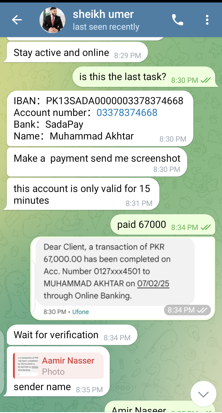 hi Team, i need to complain i have been scammed on the telegram group named “Upwork project team”. they asked me for pre-payment of 12k pkr and get back 16.8k pkr. then ask me to complete a task by paying 67k pkr and reward will be 130.7k but then they show me the website that your credit score is not suffiicient and need to pay more an amount of 198k pkr to get reward of 396k. i got scammed. attach are the proofs