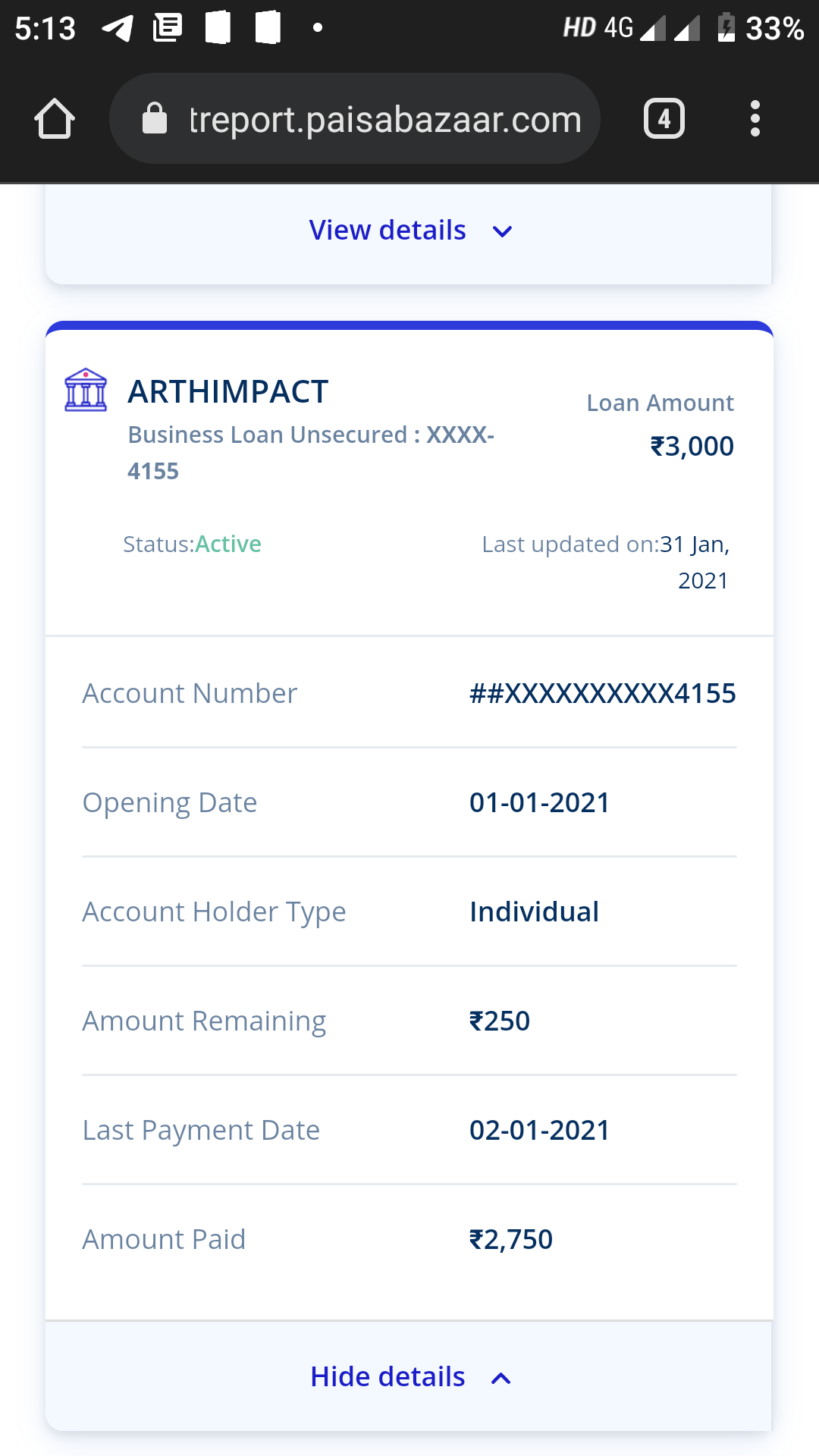 I have not taken any loan from ARTHIMPACT DIGITAL LOANS PRIVATE LIMITED. But in CIBIL, showing loan outstanding of Rs. 250 from ARTHIMPACT DIGITAL LOANS PRIVATE LIMITED. For due to this my cibil score go down