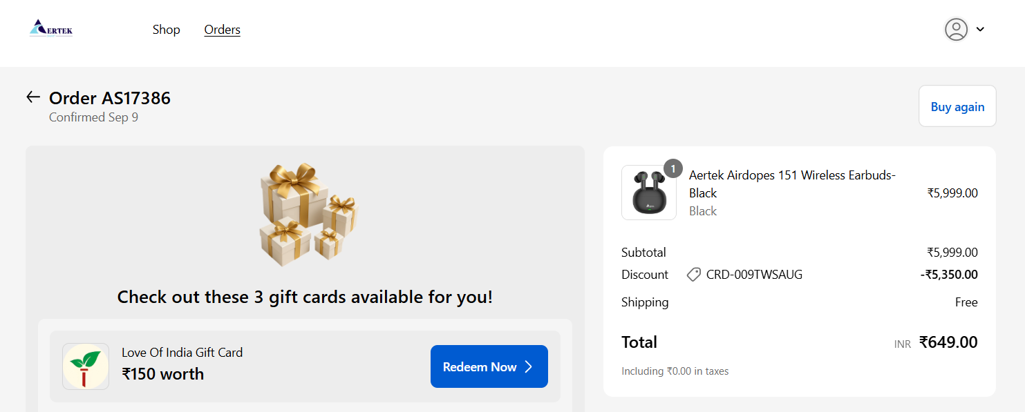 I got the coupon code in the CRED app and i have purchased the “Aertek Airdopes 151 Wireless Earbuds-Black” from the site : https://www.aerteksmart.com/ to the cost: ₹649.00.