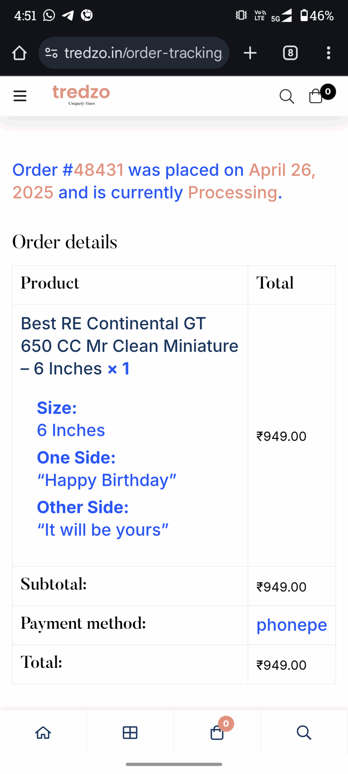 There is a website called tredzo (https://tredzo.in/) from which I had ordered a miniature of bike and the payment has been made but I am not getting any response from that website and they have not delivered my product yet.
