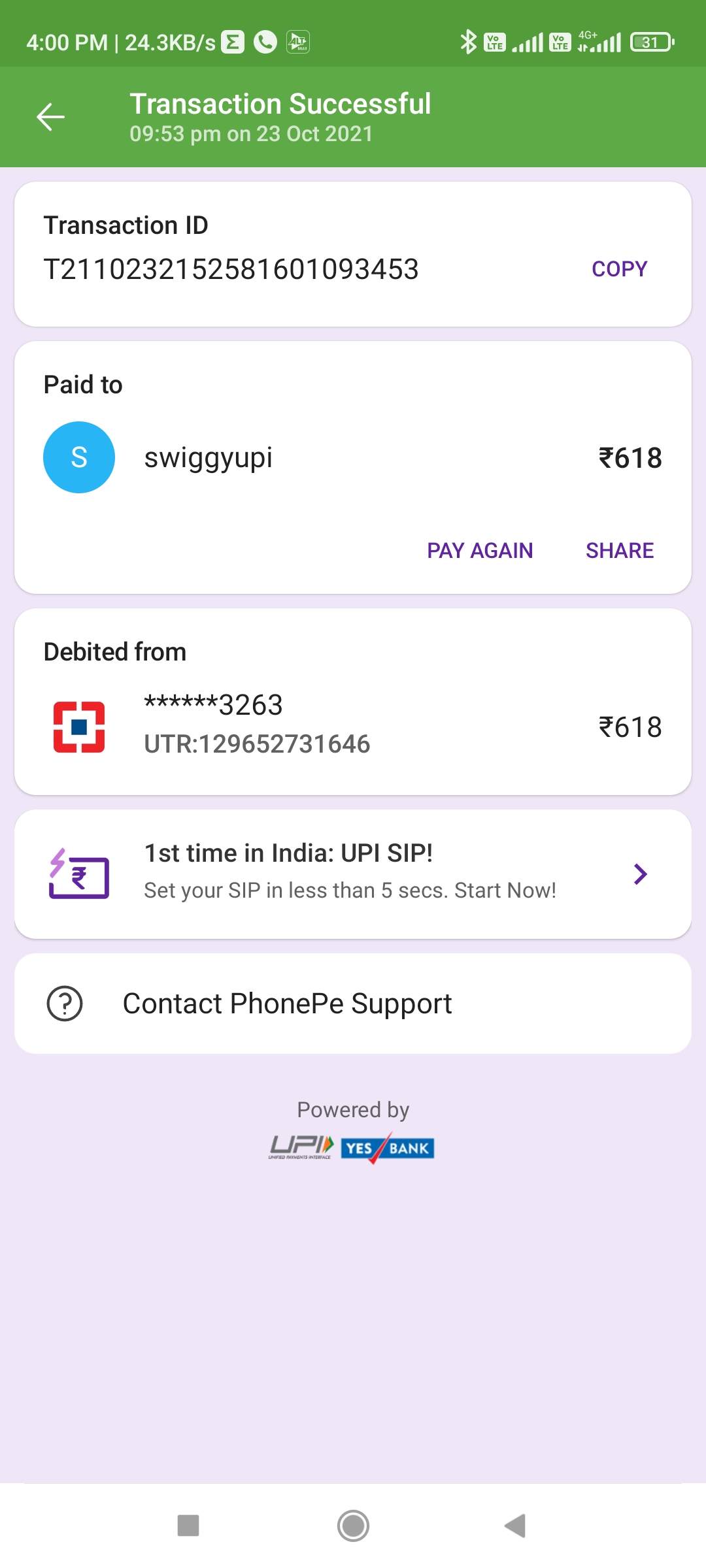 I have pay 618 floating cash on23oct 2021 but swiggy has no response on my app