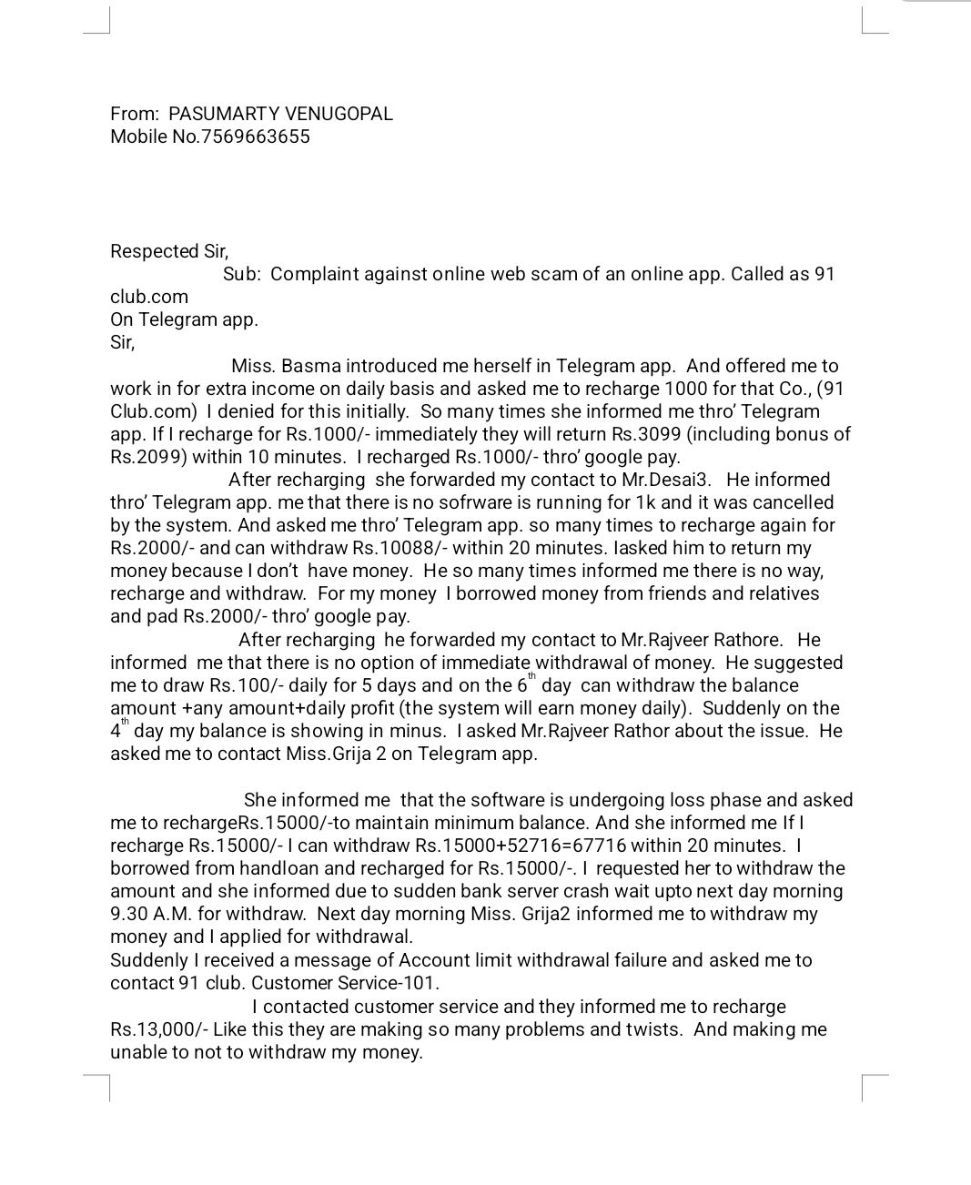 | Name(s) of companies complained against | 91club.com on Telegram app. |
