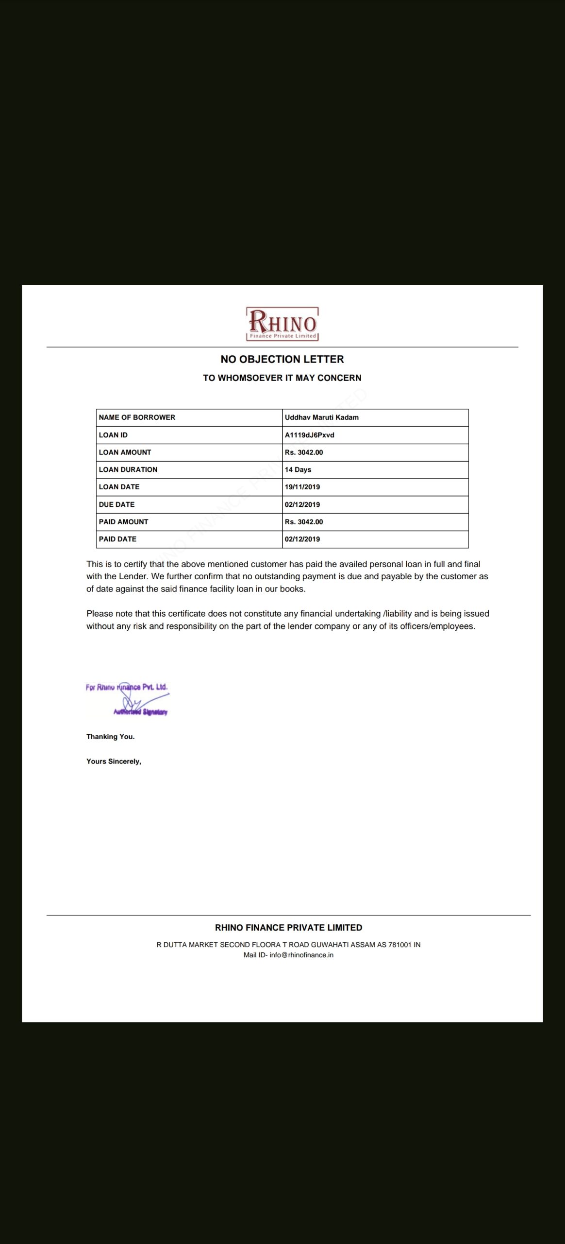 Hello, My name is Uddhav Kadam I have already paid the loan of Rhino Finance Ltd and also got the NOC. Letter but it’s Still reflecting in the cibil which was why my score got down