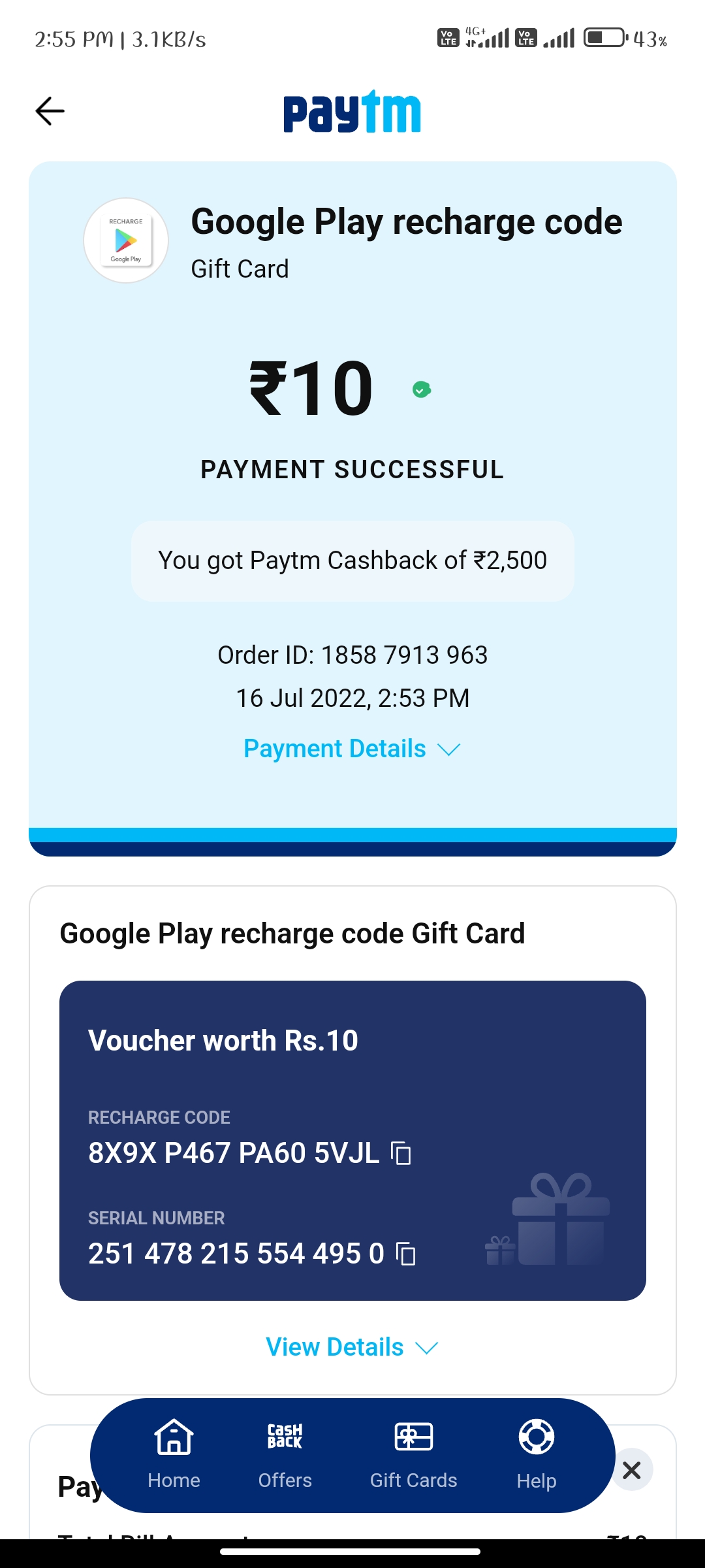 I have purchased a google play recharge code and I have received the cashback of ₹2,500 but they are not gave me any cashback, It clearly mentioned that I will get the within 24hrs but after 3 days I have not received anything.