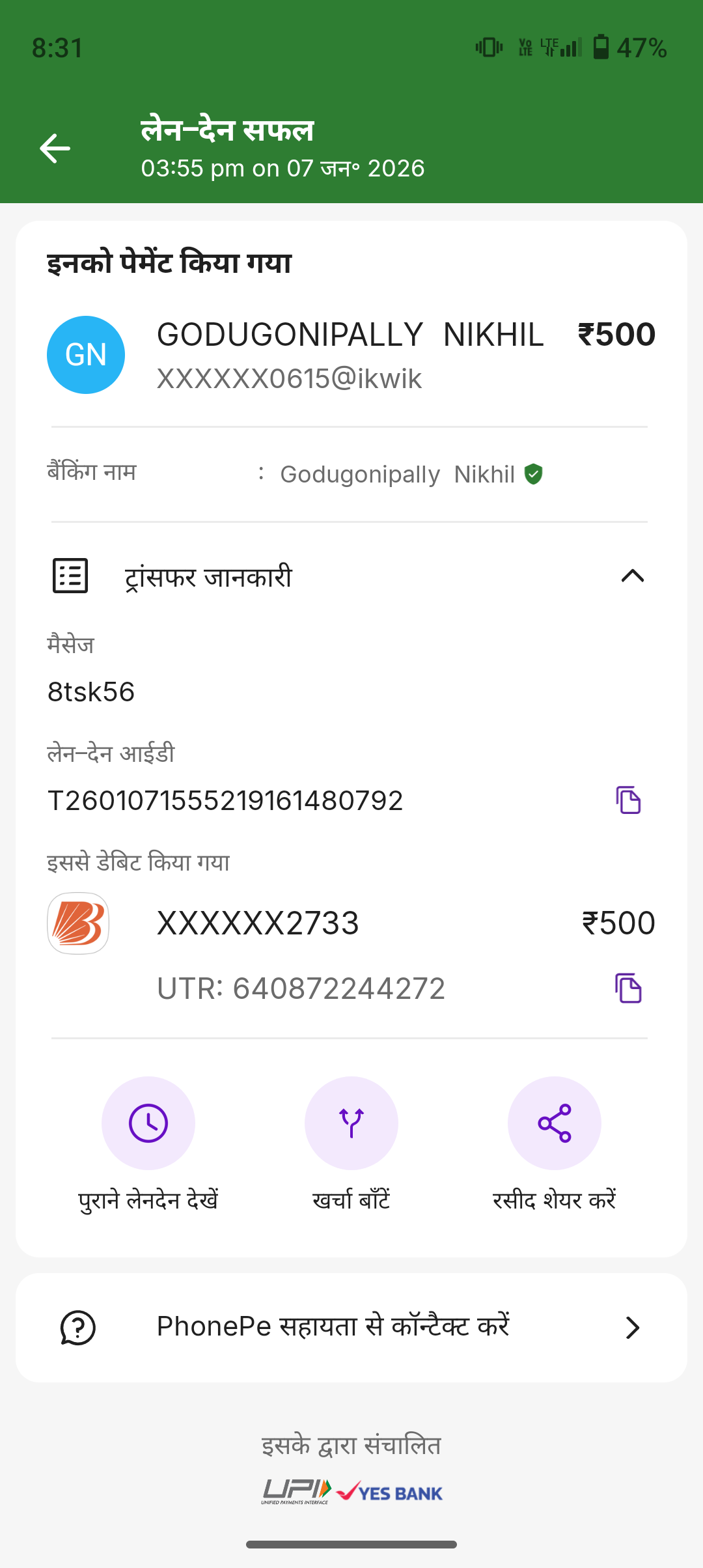 Teen patti dhani me golden Card me recharge key hai or game me nahi aaya hai 500 ka recharge uska UTR number 640872244272