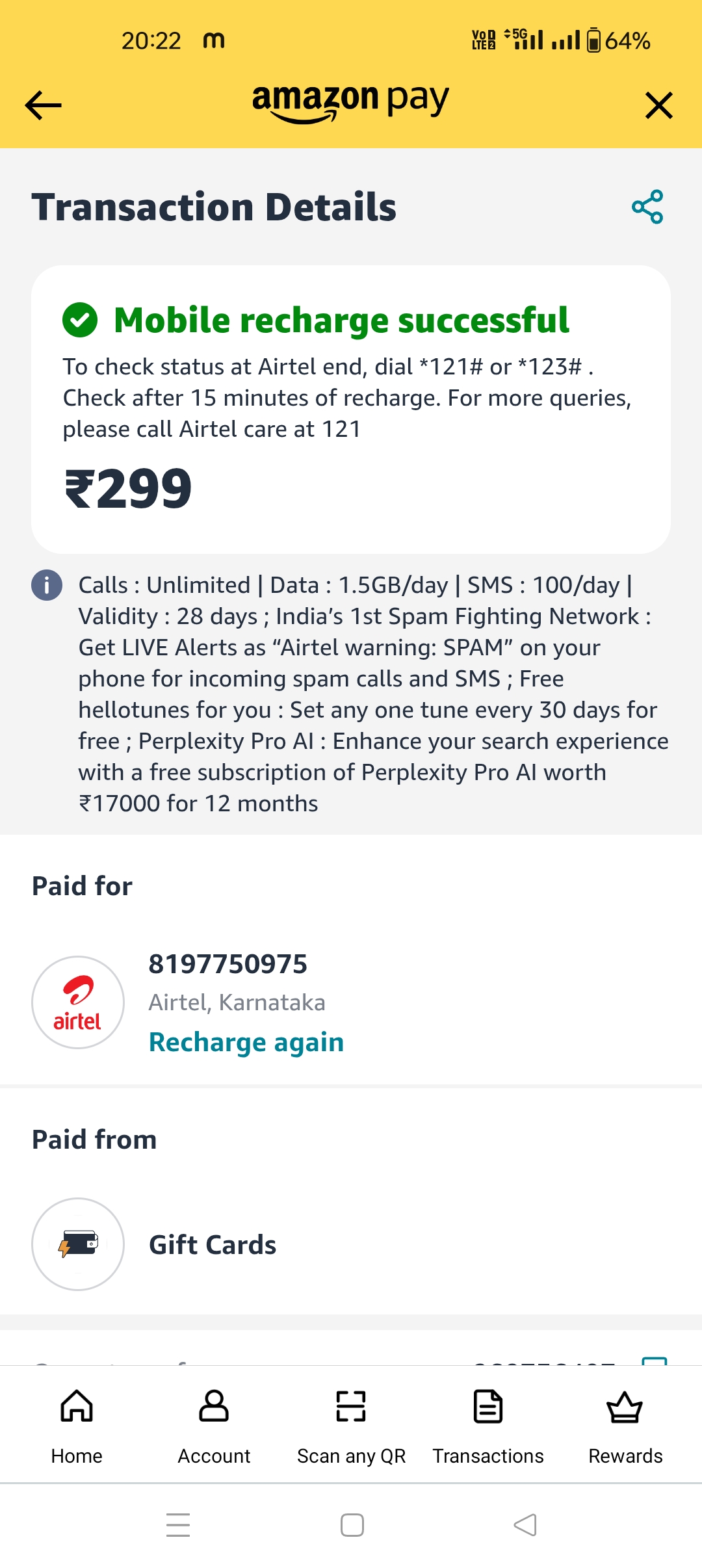 The wrong number to which I recharged is 8197750975 of rupees 299/- and no response from customer support.Kindly refund me as soon as possible.