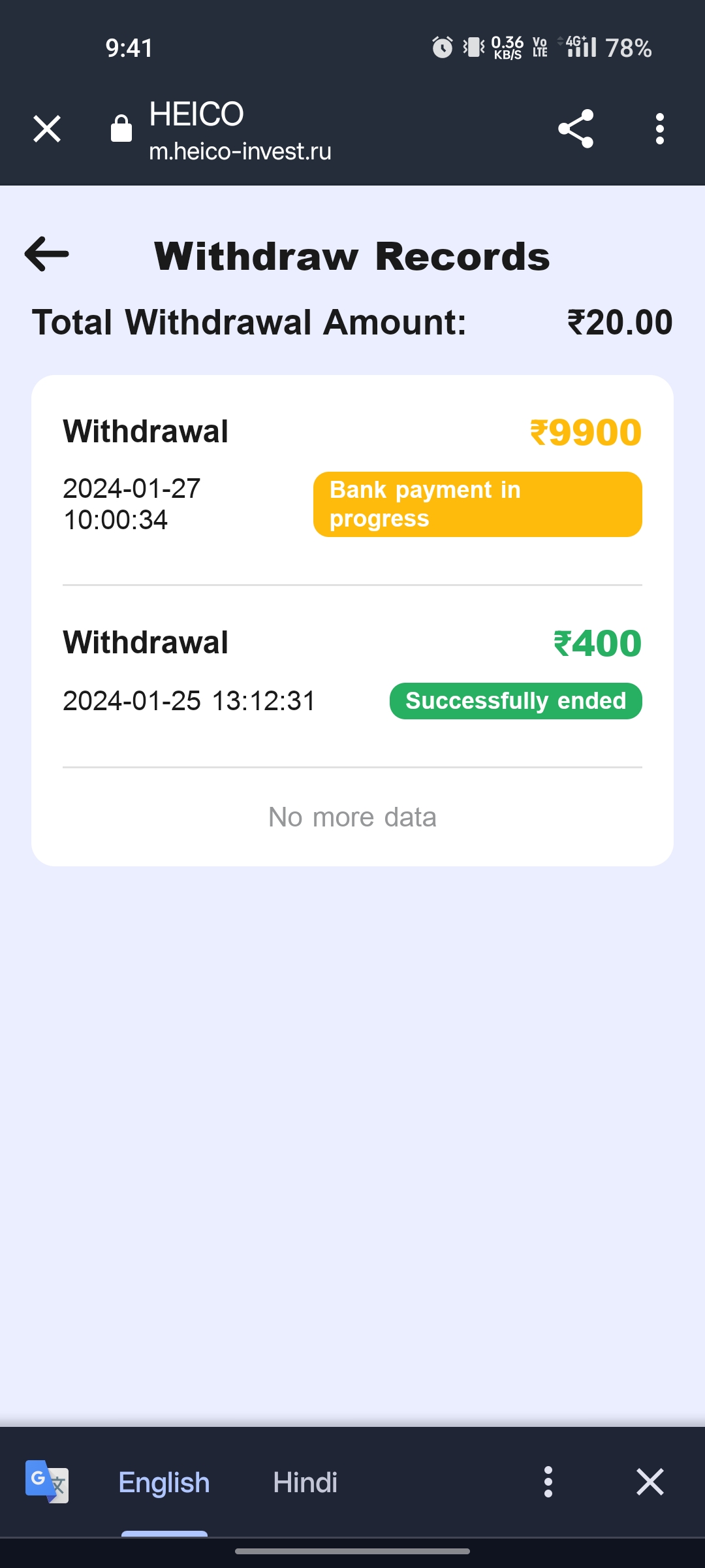I invest 4500rs on heico investment app on 26 January 2024 and i made the profit 9900 rs. Still i didnt get my profit back from last 2 week. And they promises get ur money in 1 day only. But still i didnt get any profit.