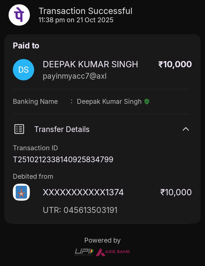 I have made a deposit of 10000 rupees in YOLO24/7at 11.37pm on oct22nd. When I m entering the UTR, it was saying duplicate deposit. And when I asked the CC, they are saying that it was processed on other platforms. When I asked on which platforms it was processed means, they are not replying anything. I am getting tensed now.