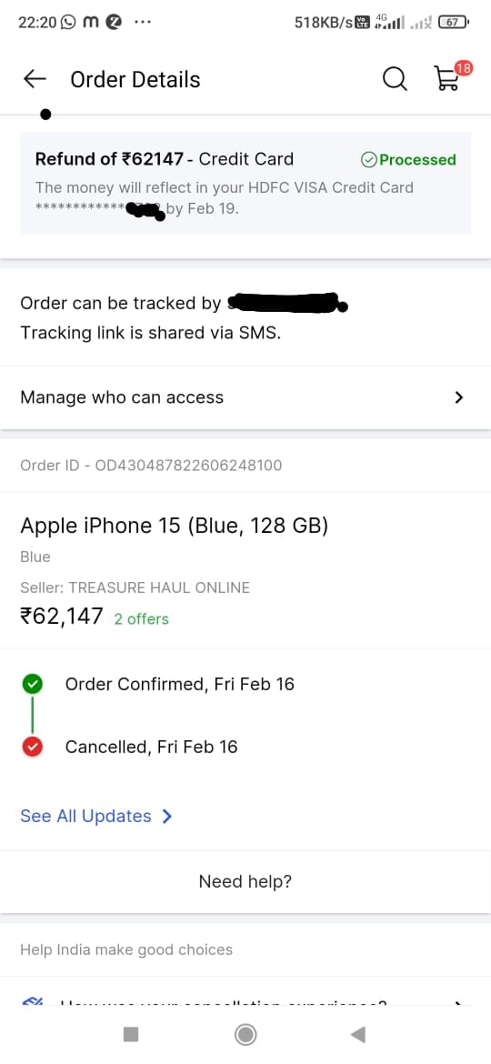 I ordered my product (Apple iPhone 15 blue 128gb) through flipcart and seller TREASURE HAUL ONLINE on 16 February 2024 at 12:32am and payment also done through hdfc credit card of amount 62,147 and product delivery date is 17 February but on the evening of 16 February 6:44pm my product canceled by seller without my permission or aware of any phone call.