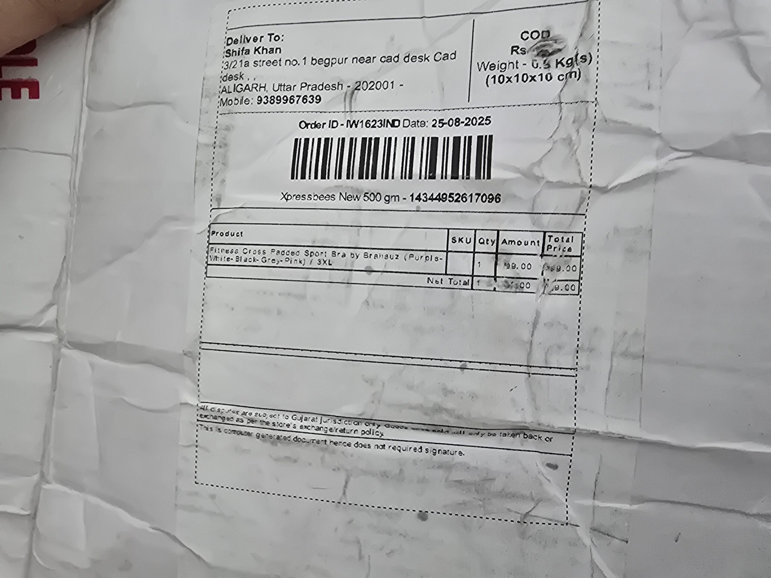 I ordered sport cross padded bra that cost 749 inr but I box received trash of paper with express bee ..order id. 14344952617096