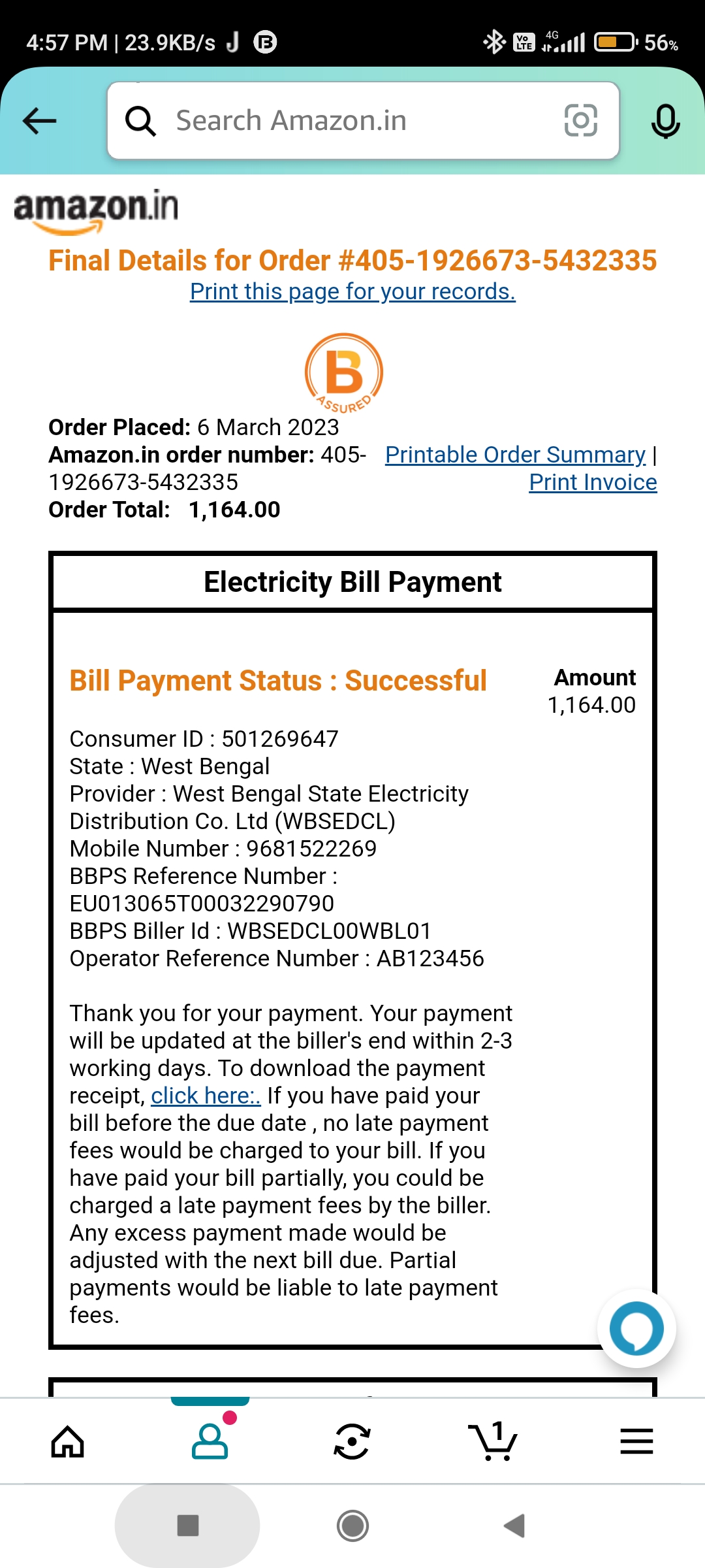 have paid my electricity bill of WBSEDCL rs. 1164 through Amazon pay on 06/03/2024. But the bill shows still unpaid in WBSEDCL website also late fees generated. Below is the payment details from amazon pay::