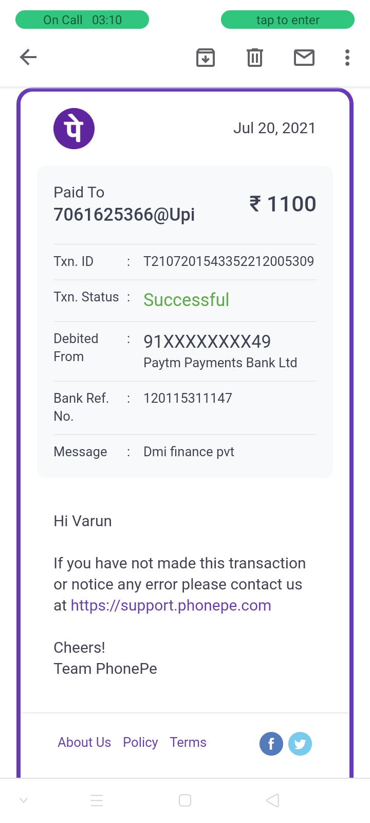 I transferred the amount bt it was not credited to the person of dmi finance agent I paid again the transfer amount was not given back