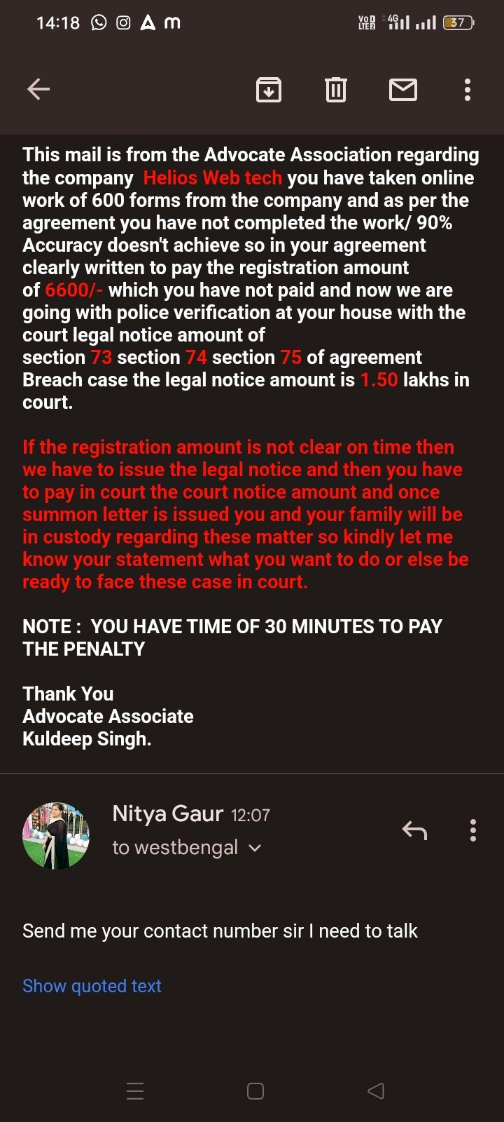 i was searching for online job therefore a company called helios webtech provide data entry jobs i accepted to work with 21600 per week oh 600 data entry with in 6 days. After these days asking me to pay penalty and registration amount total 1,50,000 To avoid case filing against me.